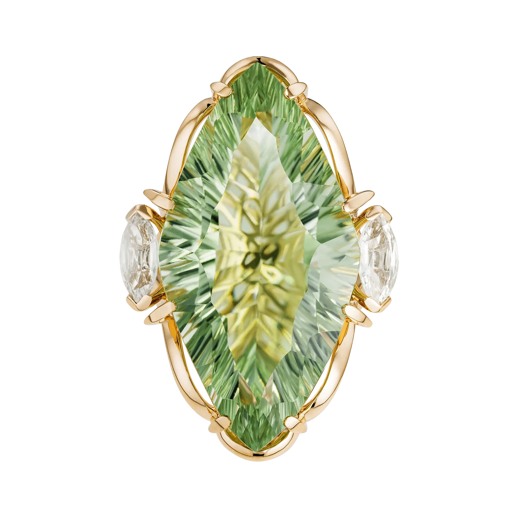 Два белых сапфира по сторонам от центрального самоцвета выступают тонкими акцентами — чистыми, как отблески росы на лепестках. Их прохладное мерцание подчёркивает деликатность зеленого кварца, усиливая ощущение прозрачности и баланса.