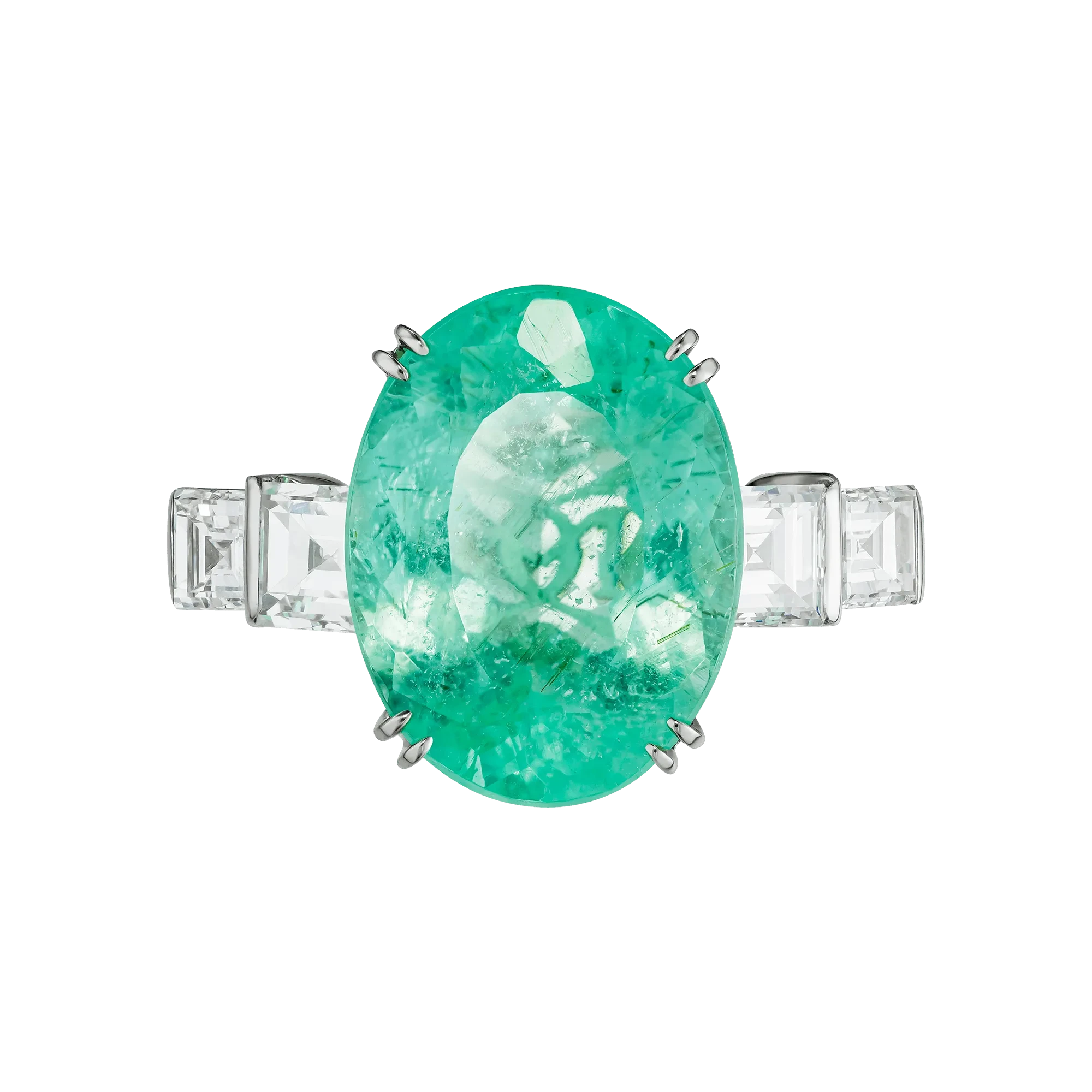 Оправа из платины выстроена как строгая архитектурная рамка, создающая нейтральное пространство для раскрытия цвета. Холодный блеск металла усиливает визуальную чистоту Параиба, а бриллианты по бокам формируют световой баланс, подчёркивая глубину и насыщенность драгоценного камня.