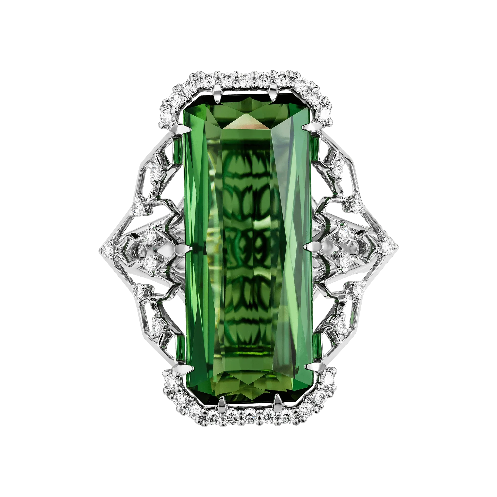 Кольцо «Эпоха в миниатюре» создано как ювелирный портрет времени, в котором эстетика ар-деко переосмыслена через современное мастерство. Вытянутый турмалин весом 10,17 карата становится смысловой осью композиции — его строгая багетная огранка задаёт ритм, дисциплину и ощущение архитектурной ясности, словно линия горизонта, прочерченная уверенной рукой.