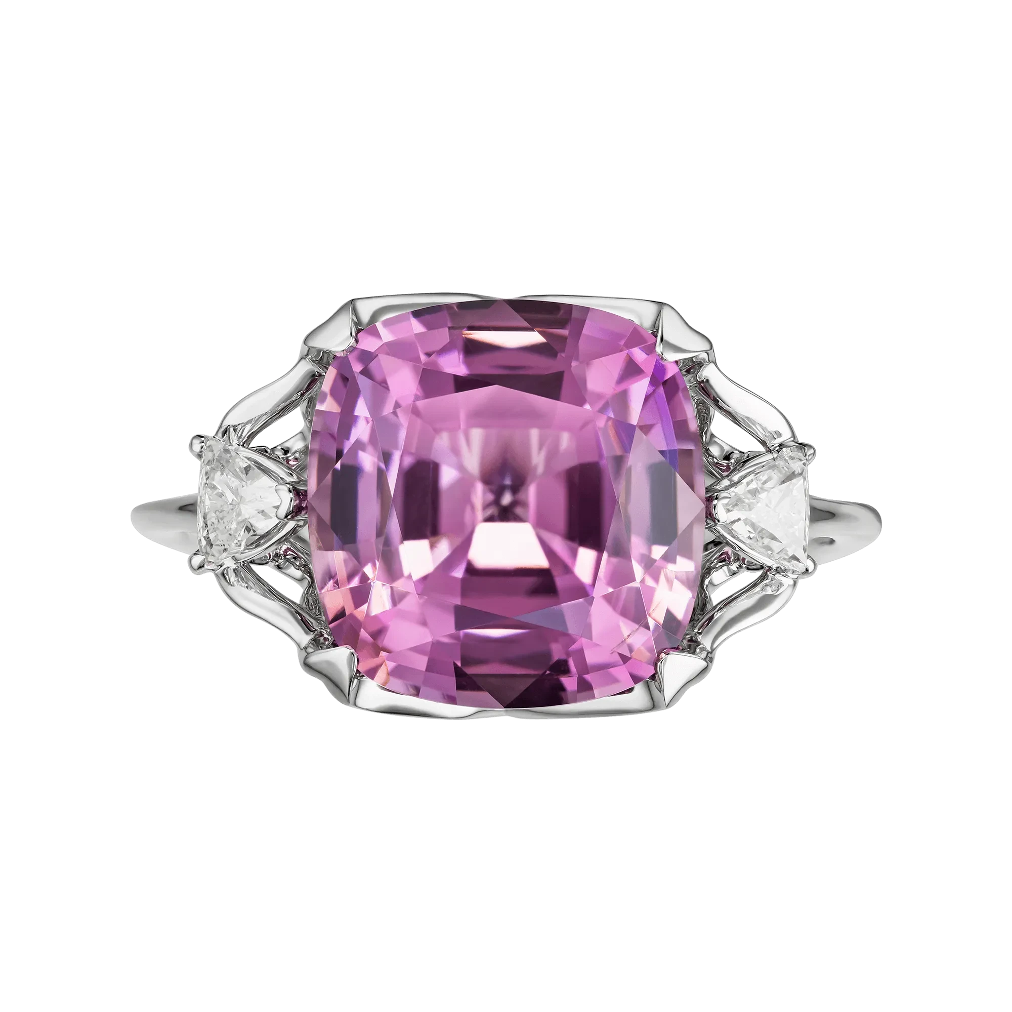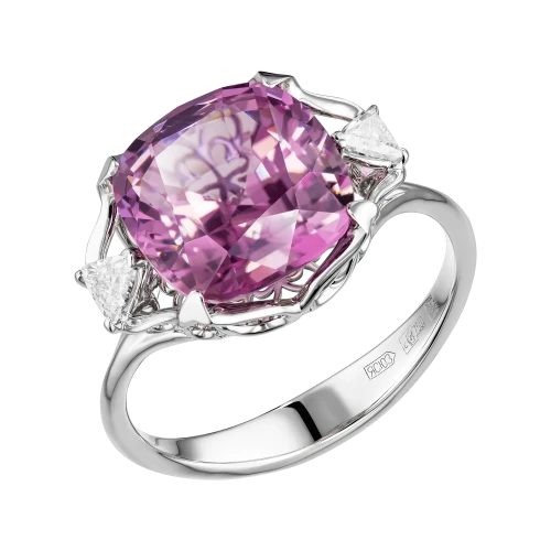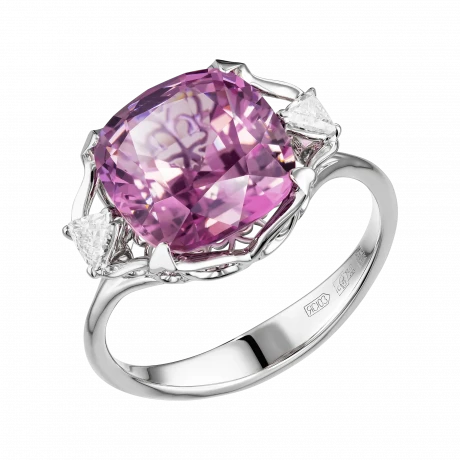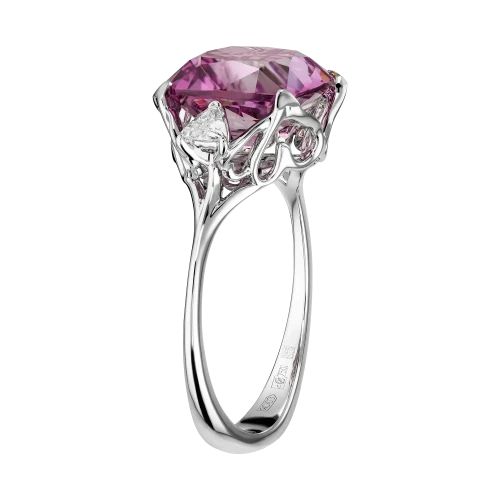 Розово-пурпурный оттенок шпинели, подчеркнутый двумя бриллиантами фантазийной огранки, заключён в оправу из белого золота, где каждая грань служит отражением света. Авторское украшение – воплощение современного понимания роскоши, где ценится не демонстрация, а вкус, редкость и совершенство исполнения.