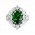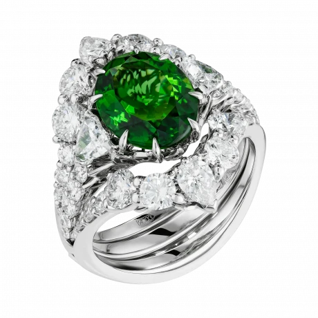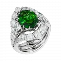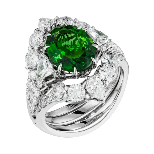 Вечерняя версия кольца раскрывается в объёмной оправе из белого золота, щедро инкрустированной крупными бриллиантами. Их холодное сияние создаёт эффект ослепительной рамки, усиливая глубину зелёного оттенка. Линии оправы выстроены таким образом, чтобы сохранить баланс между массивностью коктейльного украшения и пластикой формы.