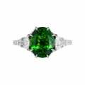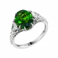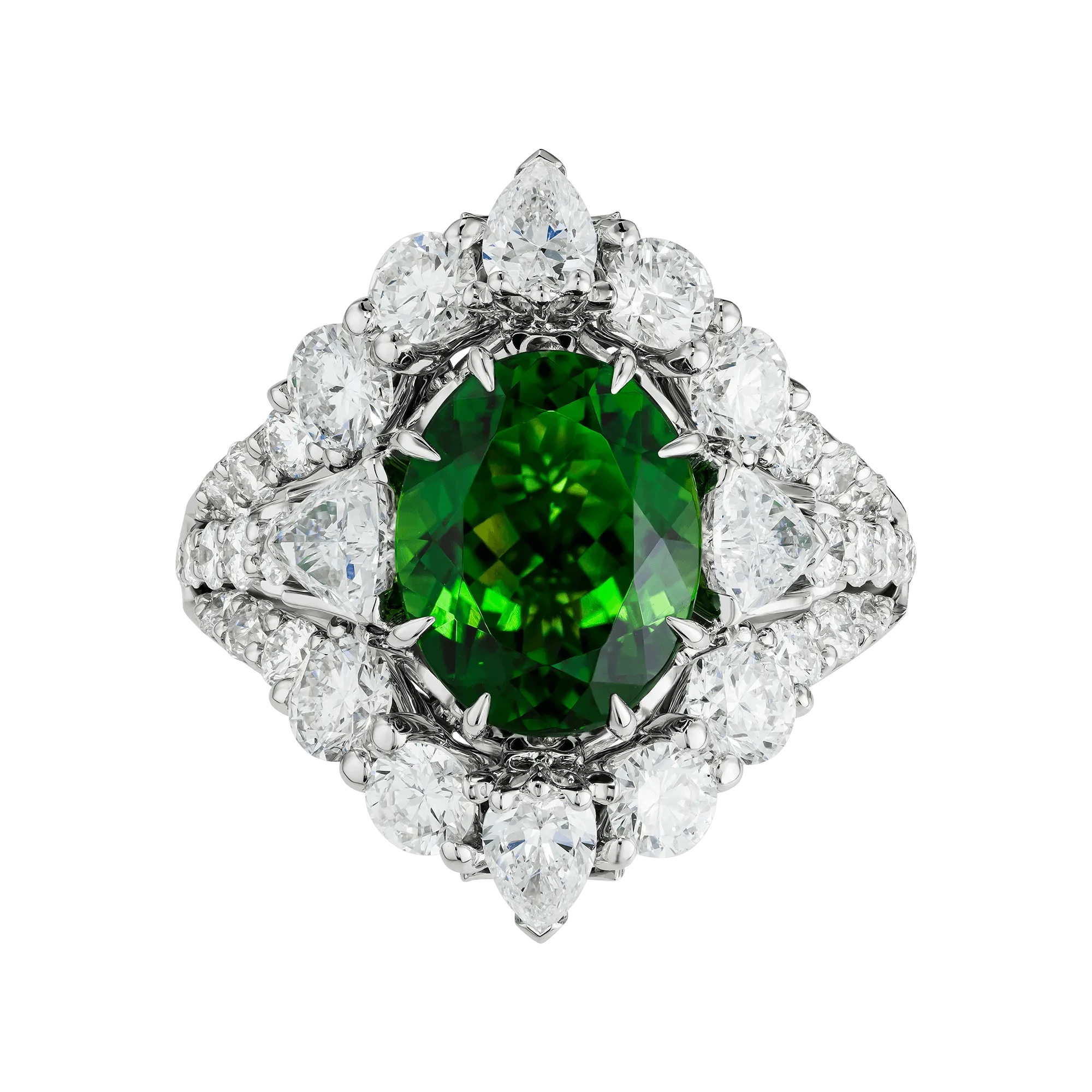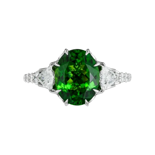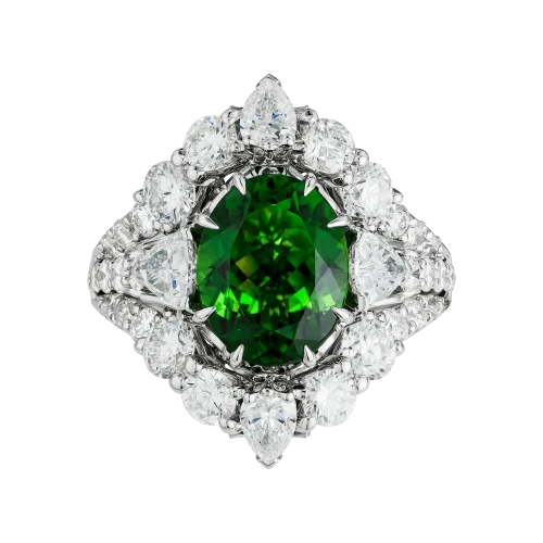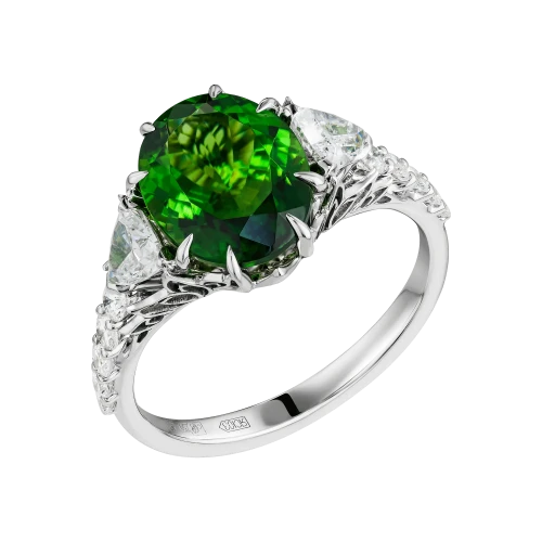 В центре — яркий хромтурмалин весом 3,24 карата, добытый в Танзании. Этот минерал ценится за интенсивный природный зелёный цвет, обусловленный присутствием хрома в кристаллической структуре. В отличие от классических зелёных турмалинов, хромтурмалин обладает более глубокой и насыщенной тональностью, близкой к оттенкам высококачественных изумрудов, но при этом сохраняет собственную характерную прозрачность и живую игру света. Камень демонстрирует высокую чистоту и выразительную световую отдачу, что делает его центральным элементом композиции не только визуально, но и с точки зрения геммологической ценности.