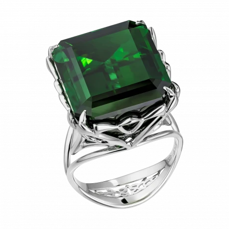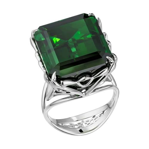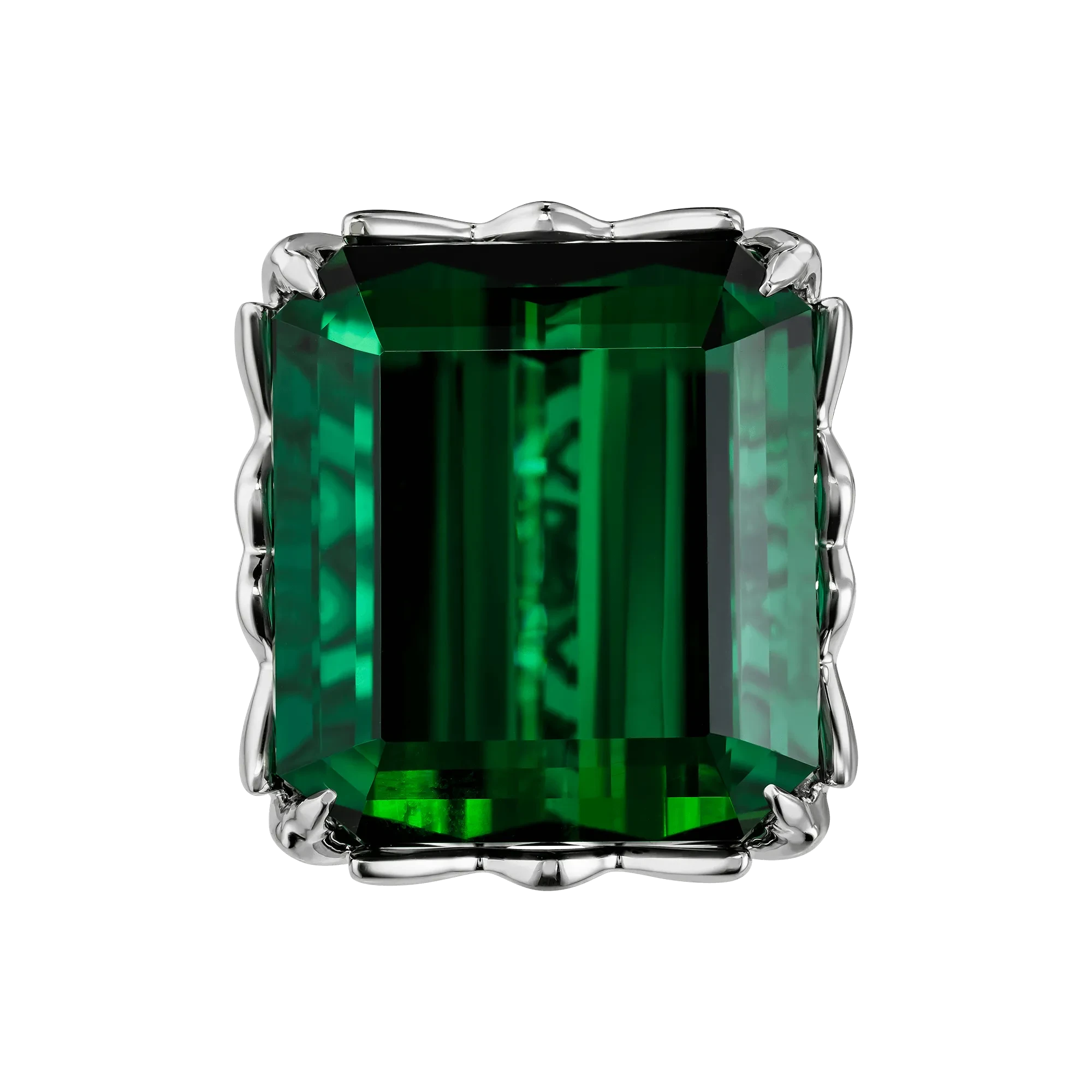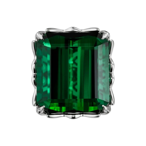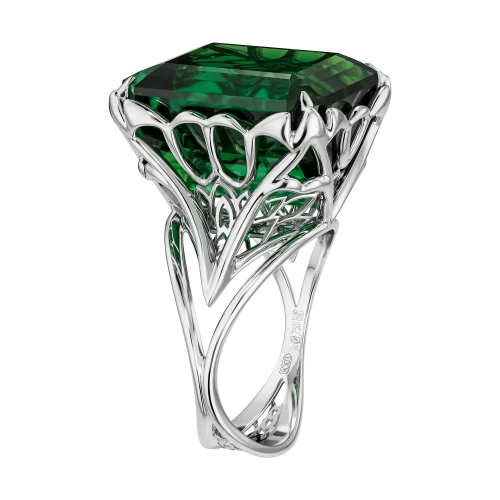 Оправа из белого золота превращает кольцо в настоящую скульптуру света. Её линии напоминают переплетение листвы, изгиб ветвей, движение воздуха. Архитектурная лёгкость конструкции создаёт ощущение парения – словно самоцвет держат не металл, а энергия самой природы.