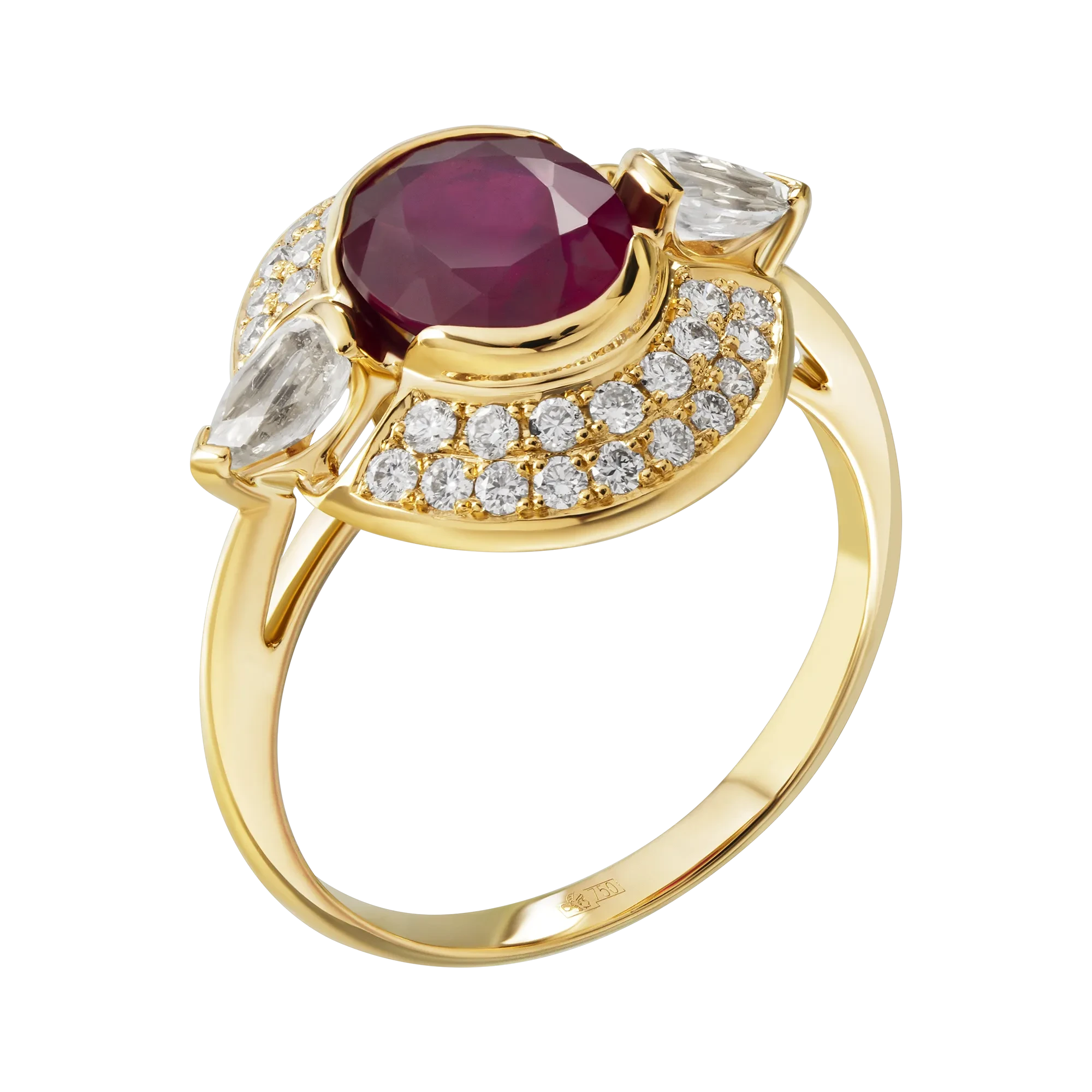 Сочный рубин, с древних времен считающийся символом любви и энергии, окружен, будто защищающей его от невзгод золотой оправой, инкрустированной бриллиантами и двумя каплевидными сапфирами, создающими эффектное мерцание вокруг центрального камня.