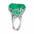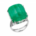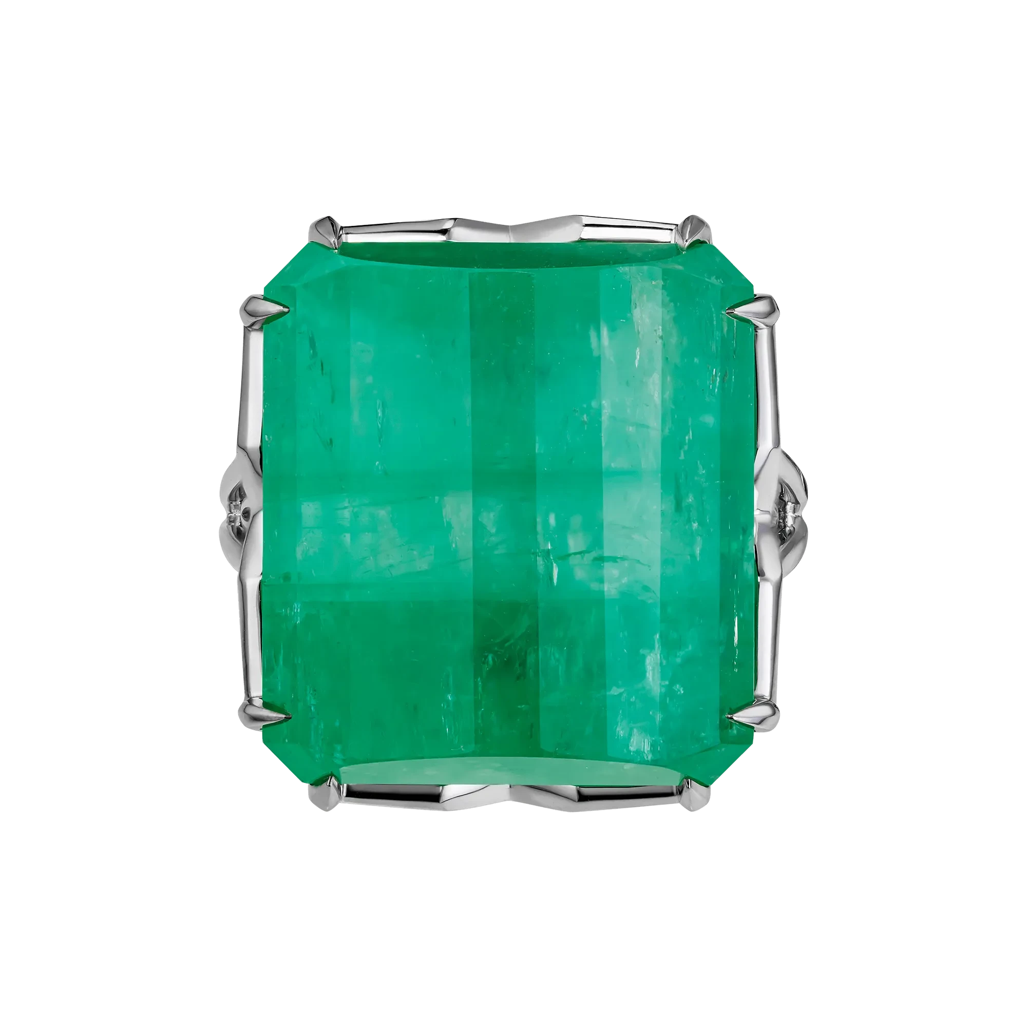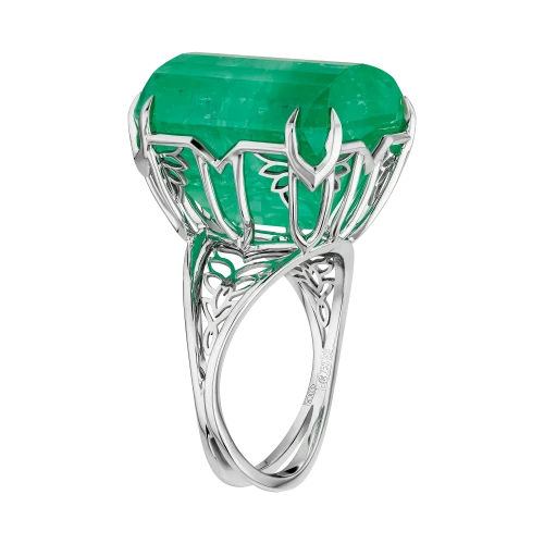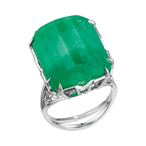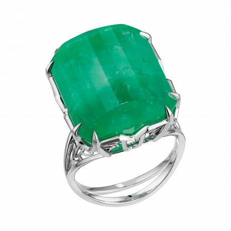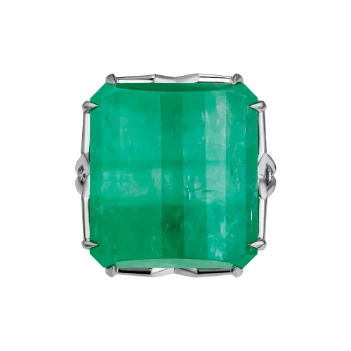 В центре композиции – уральский изумруд весом 29,15 карата, драгоценный камень исключительной природы и редкой огранки. Его насыщенный изумрудный цвет напоминает глубокую тень соснового леса и прозрачное сияние родниковой воды. Изумруды с Малышевского месторождение добываются на глубине свыше 250 метров, и крупные образцы встречаются крайне редко, что делает данный образец по-настоящему исключительным.