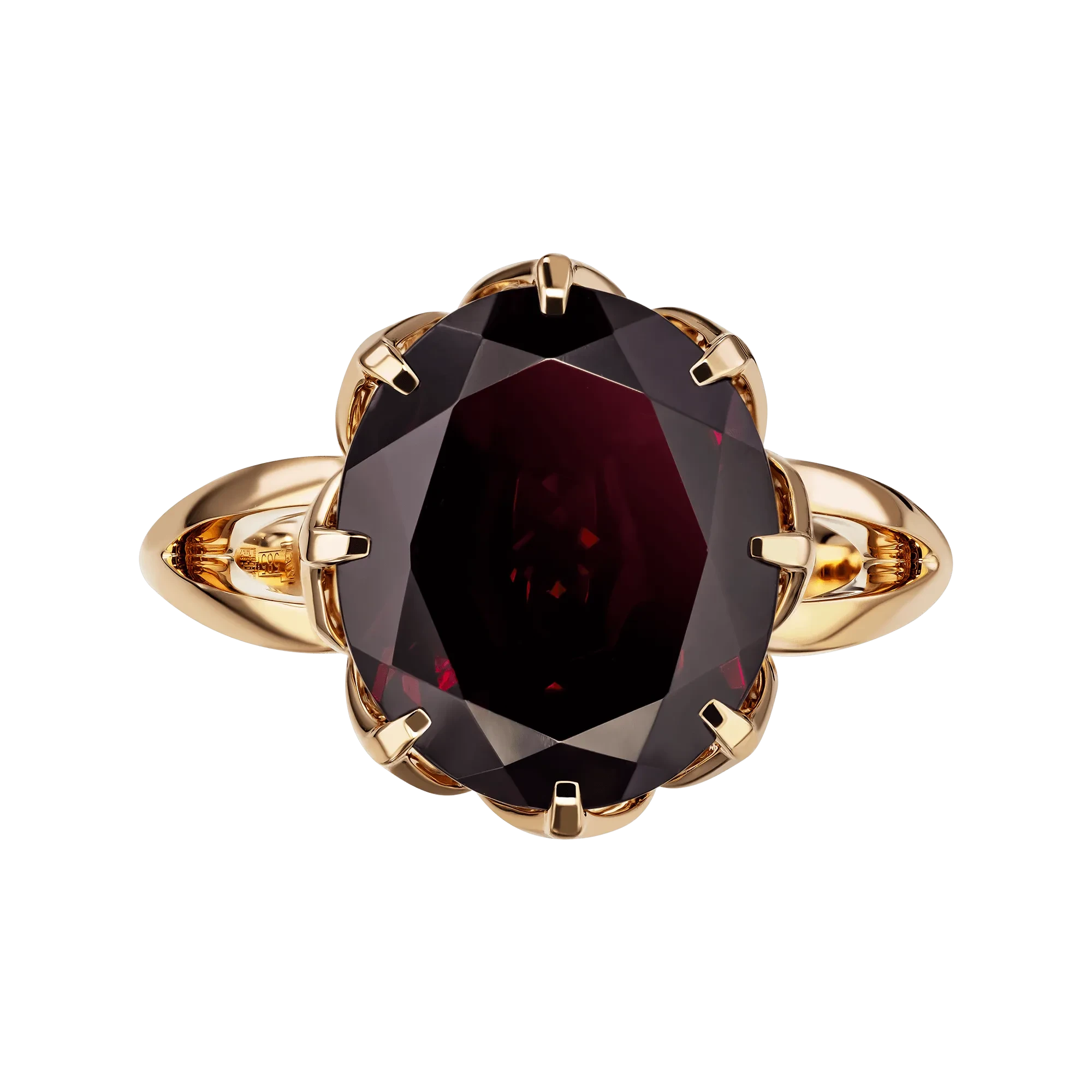 Мозамбикский самоцвет весом 9,15 карата, созревший под лучами палящего светила, с его глубокими бордовыми оттенками превосходно дополняет оправу из красного золота. Эта гармония между камнем и металлом словно оживляет историю, рассказывая о спелом плоде, полном жизни и энергии, создавая увлекательную композицию.
