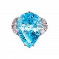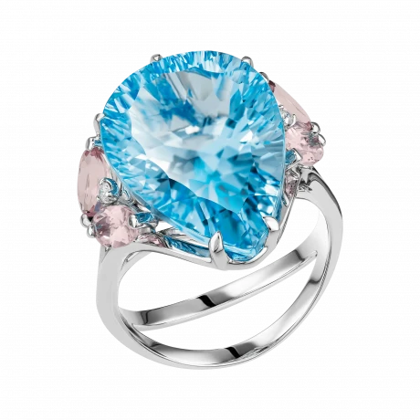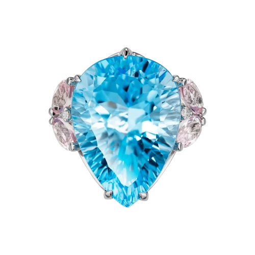 Центральным акцентом композиции стал крупный бразильский топаз огранки «капля» с насыщенным, чистым голубым оттенком. Его цвет обладает высокой световой плотностью и прозрачностью, благодаря чему камень кажется наполненным глубиной и движением. Холодная ясность топаза подчёркнута нежно-розовыми морганитами, чья мягкая, почти акварельная тональность вводит в композицию тепло и визуальную паузу. Это сочетание работает не контрастом, а тонкой цветовой настройкой — редким приёмом, требующим безупречного чувства меры.