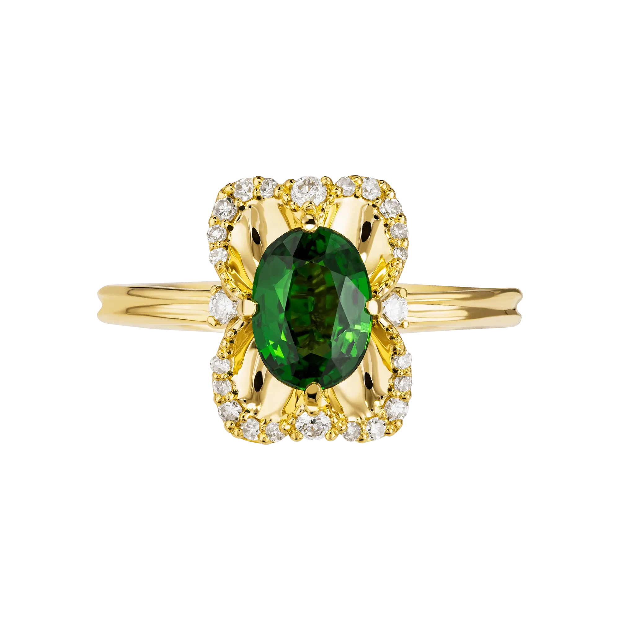 В центре композиции сияет тсаворит весом 0,98 карата — минерал, чья зелень поражает чистотой и глубиной оттенка. Его яркий цвет напоминает весеннюю природу, когда всё вокруг пробуждается и наполняется энергией. Жёлтое золото оправы придаёт самоцвету мягкое свечение, а ореол из бриллиантов усиливает сияние, создавая эффект солнечных бликов, застывших в драгоценной форме.