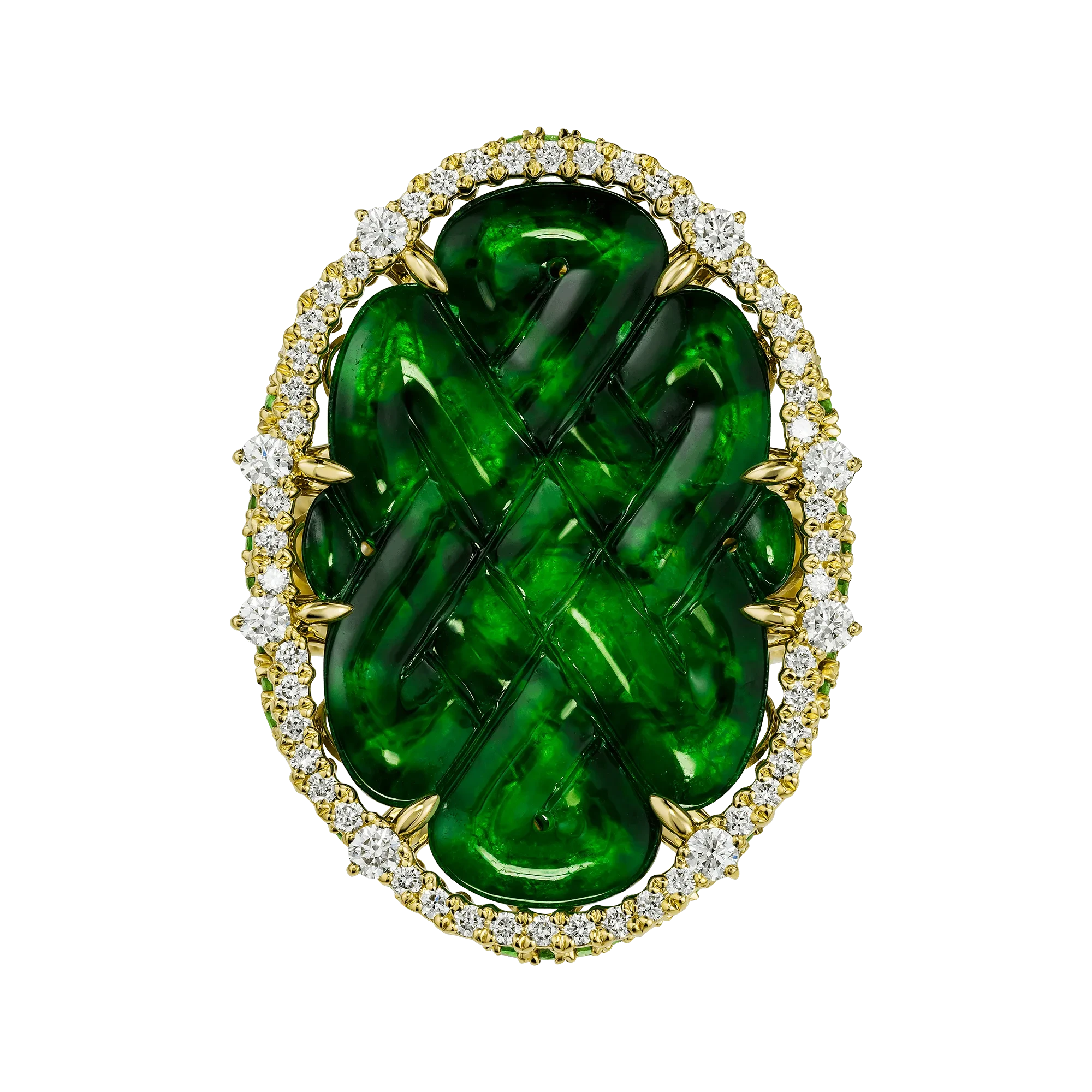В центре композиции расположен бирманский жадеит ювелирного качества — камень, исторически связанный с восточной символикой власти и преемственности. Эталонные месторождения Бирмы формируют жадеиты с высокой плотностью структуры, насыщенным зелёным цветом и однородностью материала. Резная обработка подчёркивает монолитный характер самоцвета, позволяя свету равномерно раскрывать объём и сложный рельеф формы — работа, требующая безупречного понимания материала.
