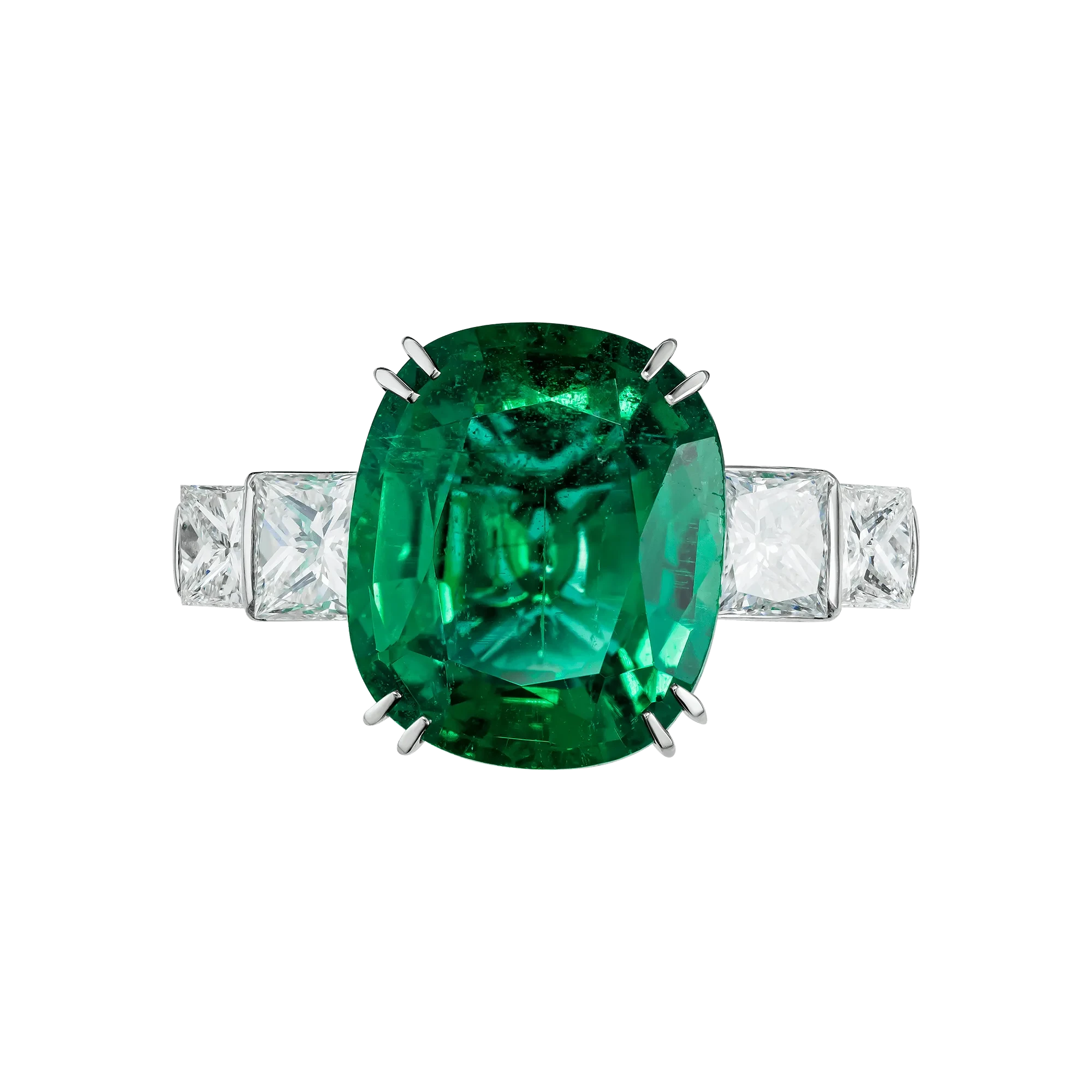 В центре композиции — изумруд из Замбии весом 4,17 карата, отличающийся ярким, насыщенным зелёным оттенком и высокой степенью прозрачности. Такой цвет ценится экспертами за живую глубину и природную энергию, которую невозможно воспроизвести искусственно. Изумруд не доминирует внешним эффектом — он притягивает взгляд постепенно, раскрываясь вблизи, что напрямую перекликается с идеей названия.