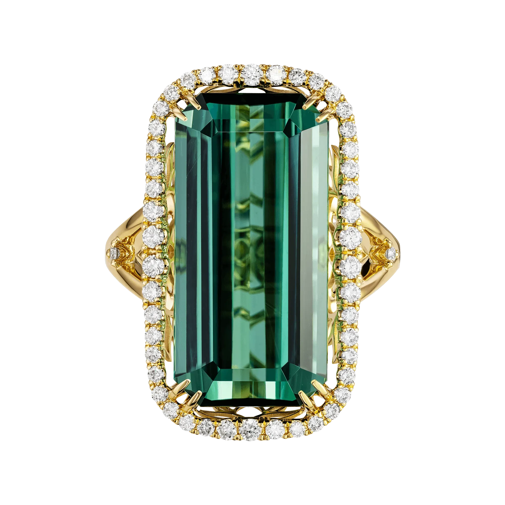 Крупный самоцвет заключён в золотую оправу, сквозь которую легко читается идея: не сковывать, а подчёркивать. Жёлтое золото придаёт конструкции тепло и глубину, создавая мягкий диалог между холодной мятой цветного турмалина и солнечным отливом металла. Вокруг – россыпь бриллиантов, как импульсы света, которые оживляют композицию, но не отвлекают от главного – внутреннего центра.