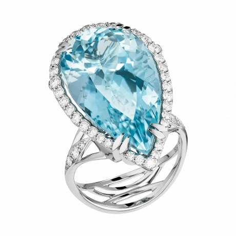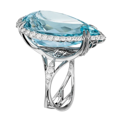 Каждая грань драгоценного камня словно пропускает сквозь себя свет, превращая его в мерцающий шелест – как прохладный ветер, играющий в листве. Белое золото оправы поддерживает самоцвет как воздушный поток, повторяющий линии руки. Лаконичность форм подчёркивает природную красоту самоцвета, а бриллианты, рассыпанные вдоль границ, добавляют искрящихся акцентов.