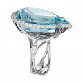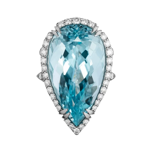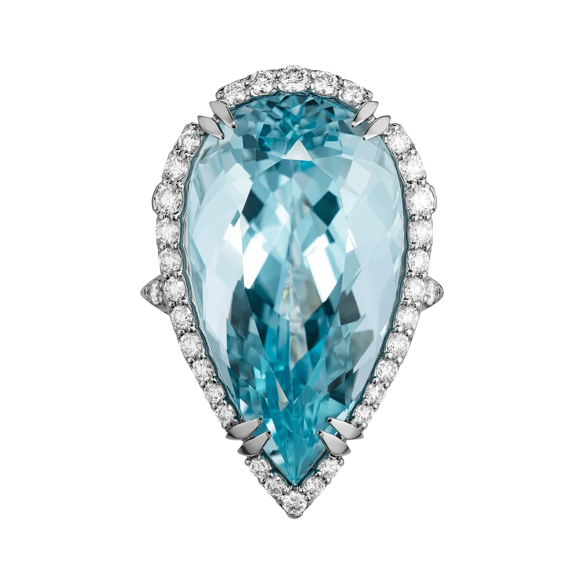 Кольцо «Июльская прохлада» словно удерживает на кончике пальца мгновение, когда лето замирает, позволяя прохладе проникнуть в самую суть дня. В центре композиции – крупный бразильский аквамарин грушевидной формы, чья лёгкая, чуть дымчатая голубизна напоминает каплю родниковой воды, сверкающую на солнце. Его вес внушителен, а оптическая чистота создаёт эффект глубины, в которой можно утонуть взглядом.