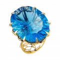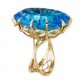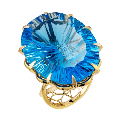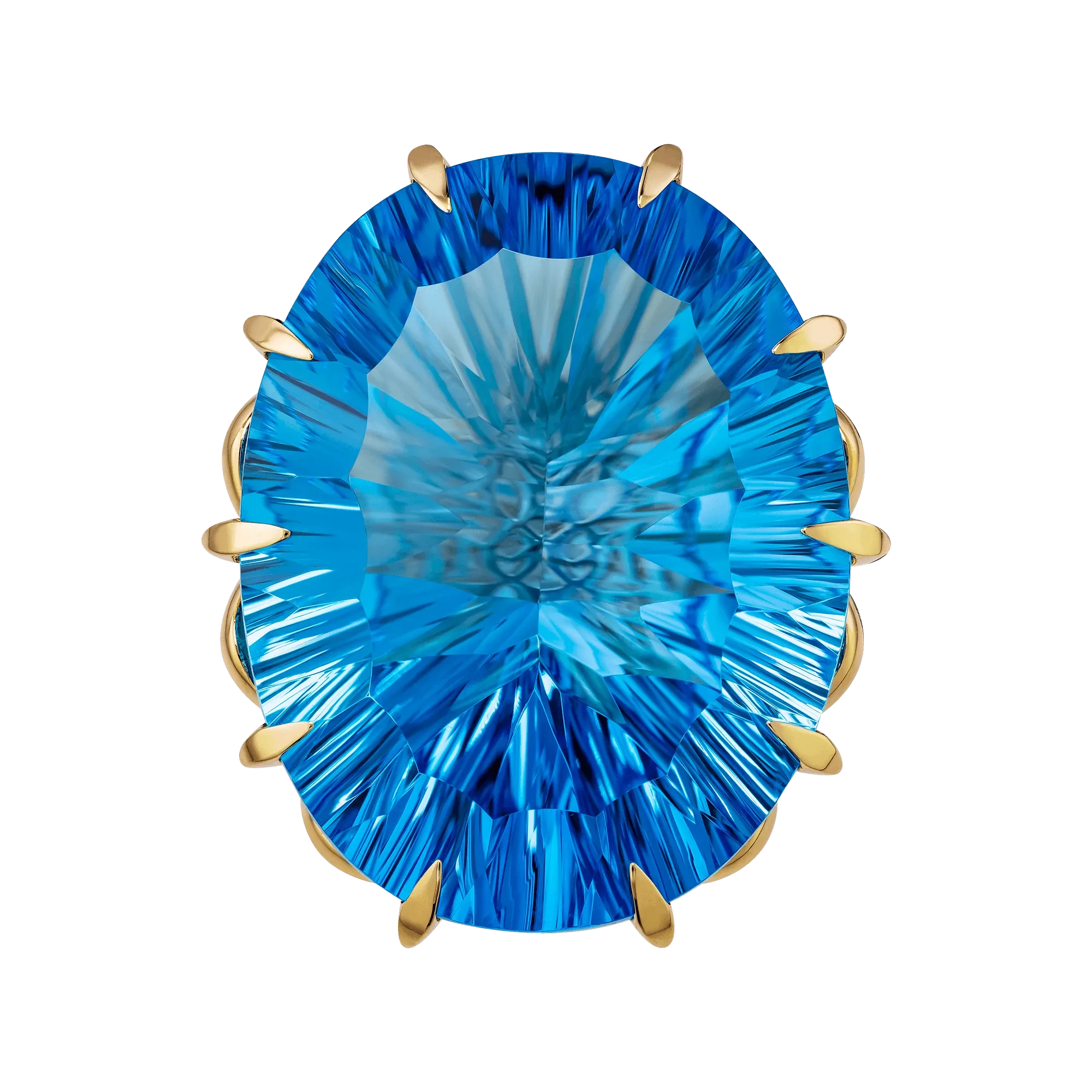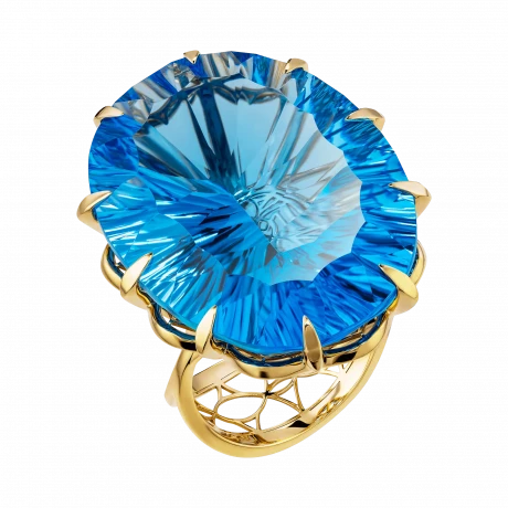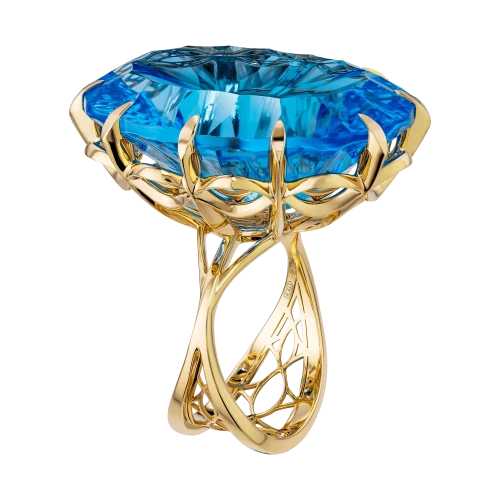Открытая оправа из жёлтого золота с графичным узором подчёркивает парящий характер композиции. Она не удерживает топаз, а сопровождает его – как тонкий контур воздуха, обрамляющего небесный поток. Это кольцо не требует объяснений. Оно создано для тех, кто чувствует: красота может быть бесформенной и всё же вечной, как ветер, оставляющий память в движении.