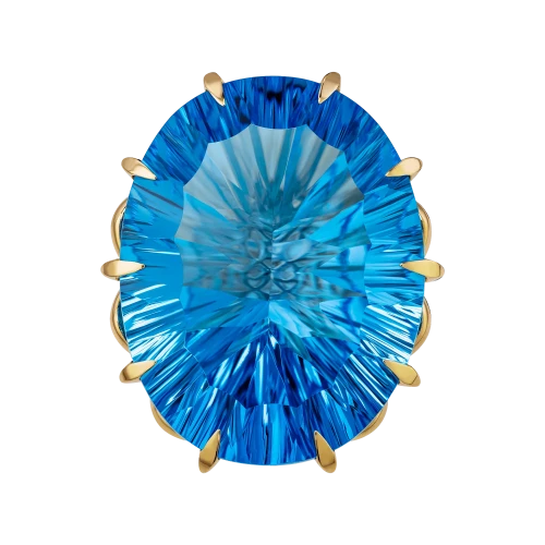 Фантазийная огранка делает природный камень живым: его внутренняя структура напоминает воздушные потоки, рассекающие пространство. Свет, попадая внутрь, не просто отражается, он словно парит, создавая игру переливов, будто закрученные вихри над морем. Цвет – чистый, свежий, насыщенный – будто не имеет плотности, и в этом парадоксе рождается истинная выразительность.