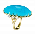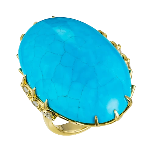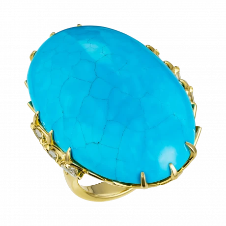 Величественная бирюза из Аризоны весом 44,56 карата стала центром авторского кольца, в котором природа словно оставила свой след – хрупкий узор прожилок, похожий на карту ветров, прочерченную на небесной глади. Этот редкий камень, известный своей неповторимой структурой и насыщенным небесно-голубым оттенком, ценится во всём мире за чистоту тона и природную игру линий, создаваемую самой землёй.