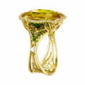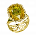 Ажурная оправа из жёлтого золота поддерживает этот ритм, а бриллиантовое обрамление придаёт украшению архитектурную точность и идеальный баланс. В глубине кольца мастера разместили узор из тсаворитов и цветных сапфиров – скрытую деталь, благодаря которой создаётся эффект внутреннего мерцания.
