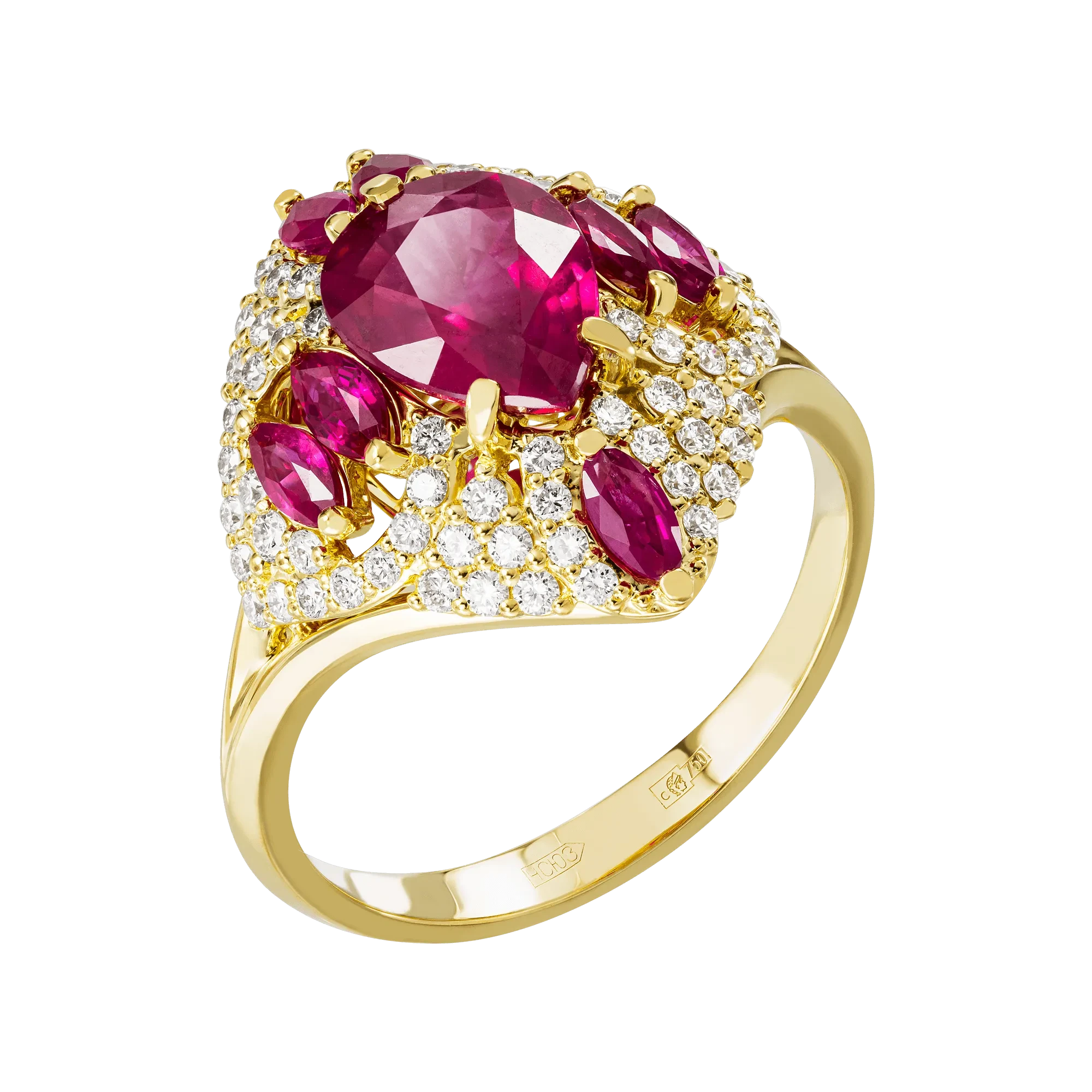 Гордый блеск пламенных рубинов сразу заставляет присмотреться к эксклюзивному кольцу из желтого золота «Крест огня». Сложный символ, образованный сочными корундами в центре украшения призывает вспомнить о древних временах, когда люди верили в богов, олицетворявших необузданные стихии, стремясь быть такими же сильными.