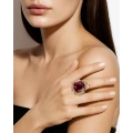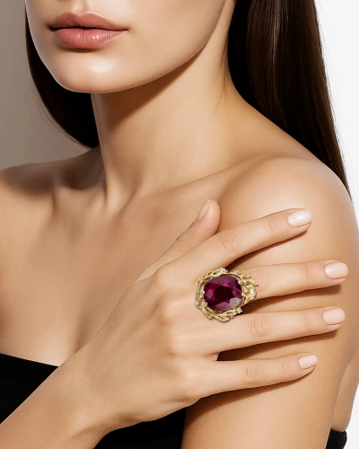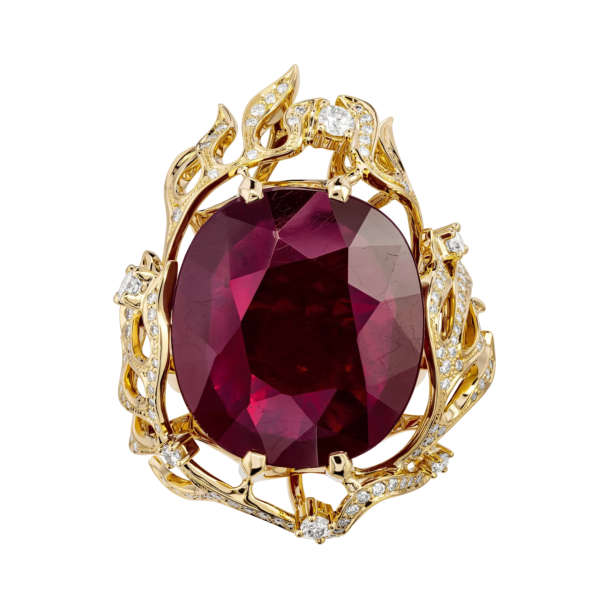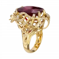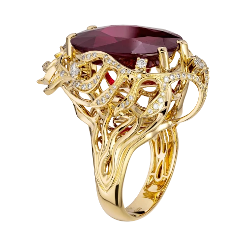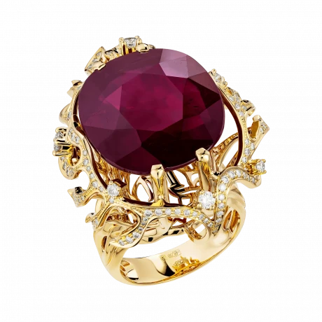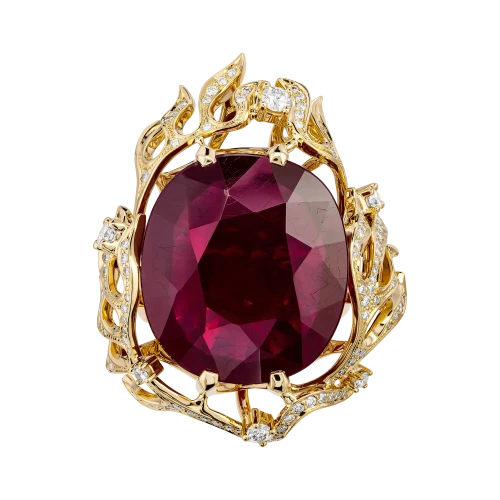 Самоцвет огранён так, чтобы ловить малейшее движение света и превращать его в тёплый внутренний жар. Его сияние не резкое, а глубокое бархатистое, как дыхание вечера. Более ста бриллиантов, рассыпанные по поверхности кольца, напоминают искры, освещающие путь – они задают ритм и наполняют композицию динамикой и тайной.