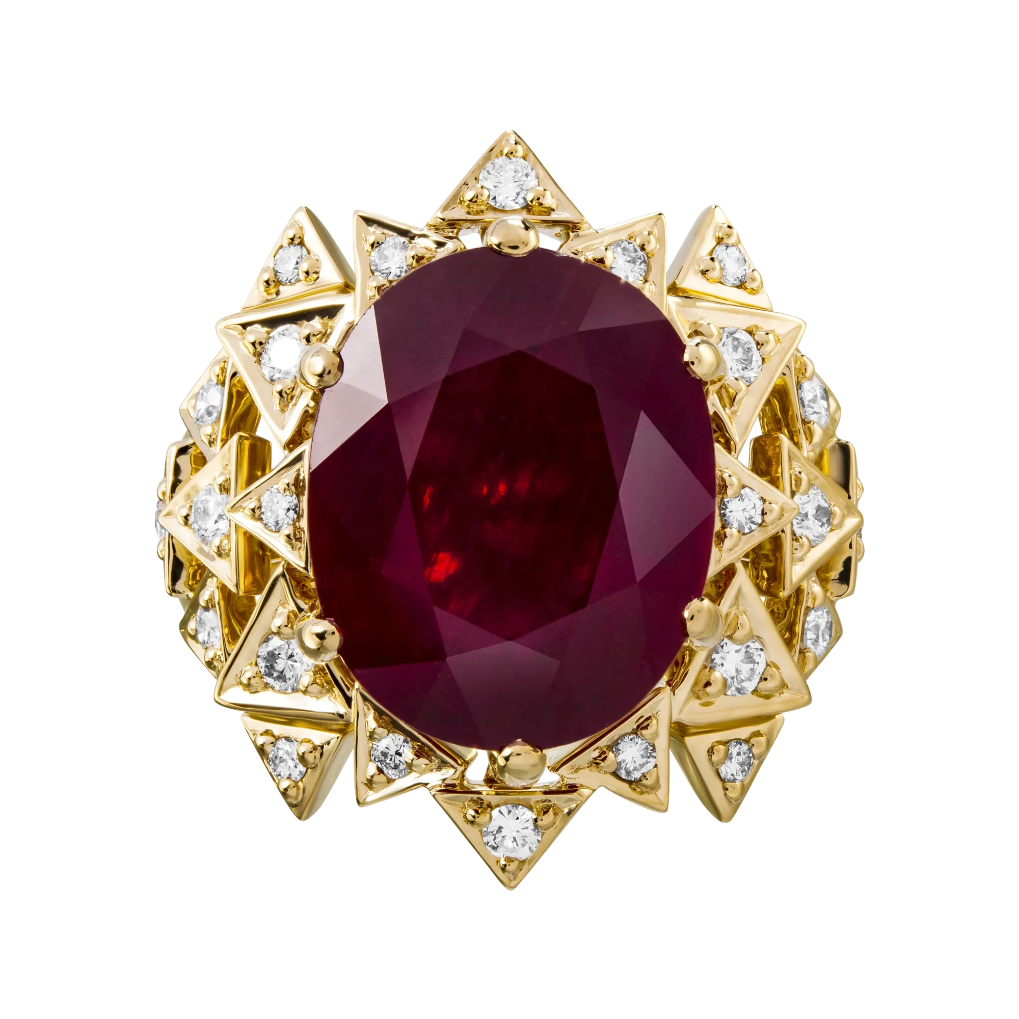 Крупный, весом 13,99 карата, корунд родом из Мозамбика завораживает игрой сочных багряно-пурпурных оттенков, буквально иллюстрируя природную магию – со времен Олимпийских богов рубин считается символом любви, энергии и власти.