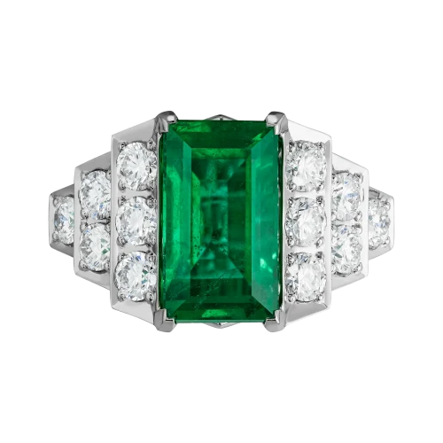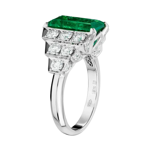 Оправа из белого золота, созданная мастерами Maxim Demidov, воплощает образ символической лестницы, ведущей вверх — к самому ценному. Ступени из бриллиантов формируют ритм восхождения, направляя взгляд к изумруду, который с древних времён ассоциировался с великой любовью, верностью и бессмертием чувств. В этом украшении драгоценный камень становится не просто центром композиции, а вершиной — точкой притяжения света, истории и смысла.