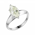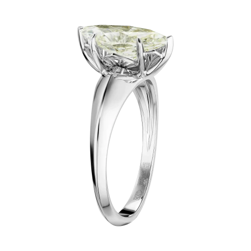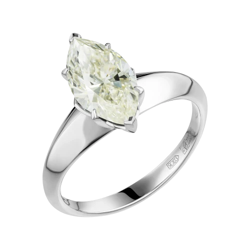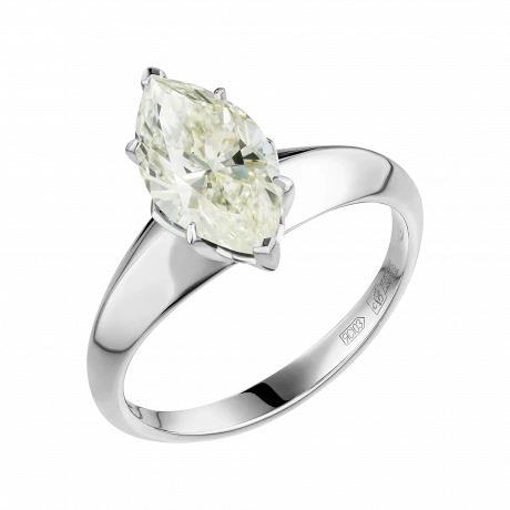Минималистичная оправа из белого золота почти не касается бриллианта, позволяя свету свободно проникать в его грани и раскрывать солнечную игры отражений. Тонко вытянутая шинка плавно поднимается к центральному камню, формируя изящную линию и подчёркивая утончённый характер кольца.