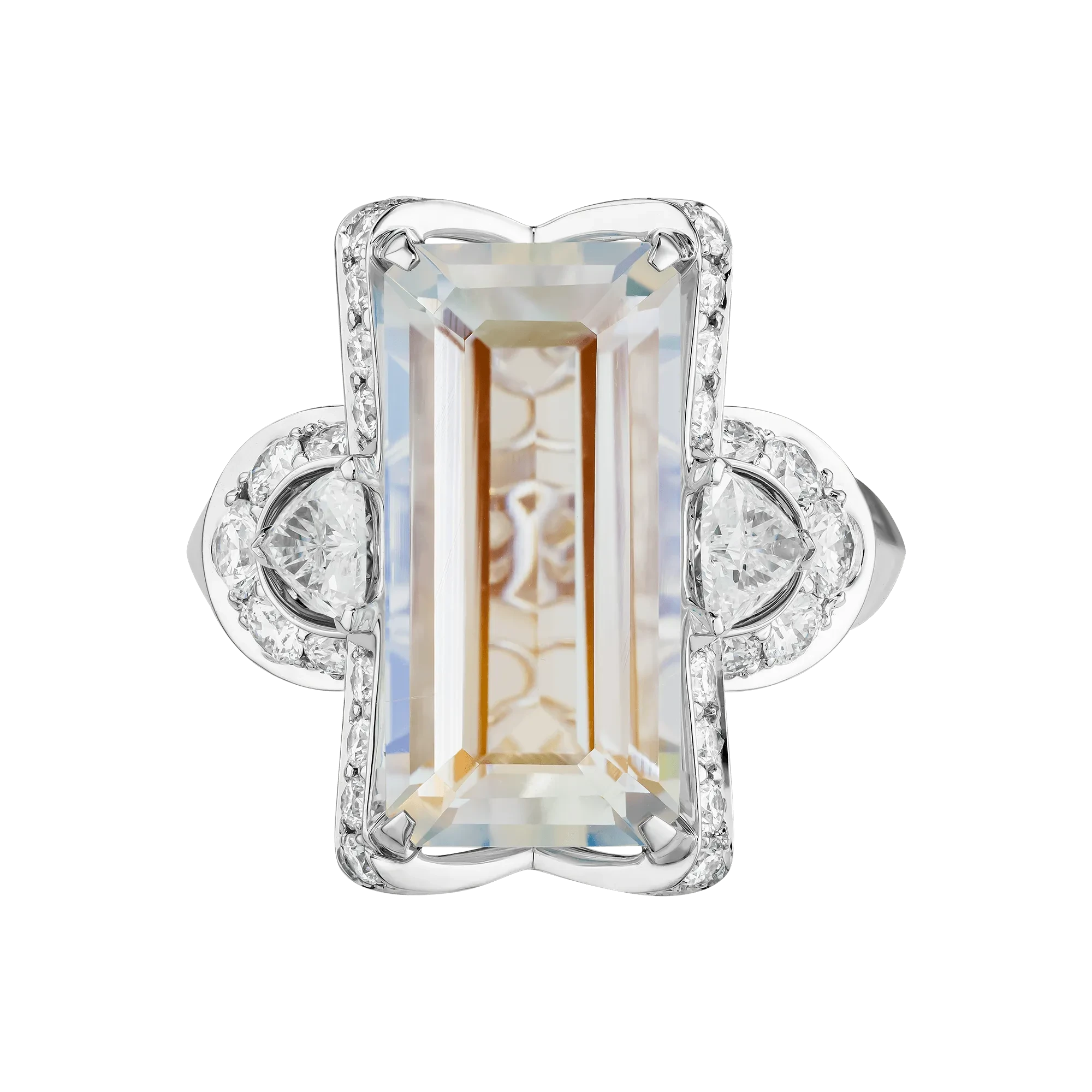 Оправа из белого золота создана как лёгкая архитектурная конструкция: плавные линии и ажурные элементы формируют пространство, в котором самоцвет будто парит. Бриллианты, расположенные по контуру, добавляют тонкие акценты — не конкурируя с центральным камнем, а поддерживая его нежное сияние, придавая композиции глубину и визуальную прозрачность.