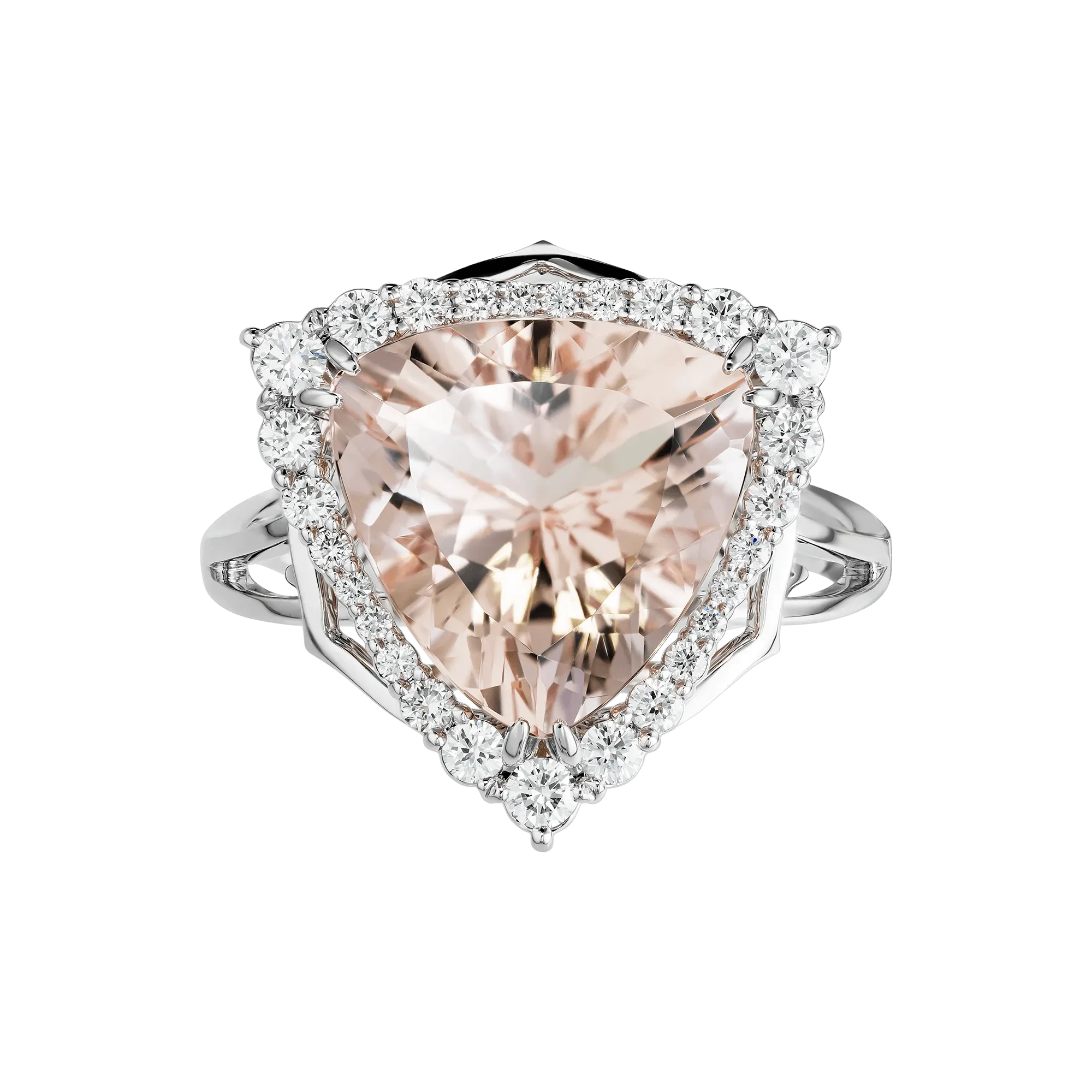 В центре композиции — морганит пудрового оттенка весом 4,65 карата. Его мягкое, чистое сияние напоминает свет раннего утра — спокойный, рассеянный, лишённый резких контрастов. Цвет камня словно удерживает тепло прикосновения и ощущение искренности, в которой нет защиты, но есть уверенность. Ореол из бриллиантов деликатно поддерживает морганит, усиливая его внутренний свет и подчёркивая тонкость оттенка.