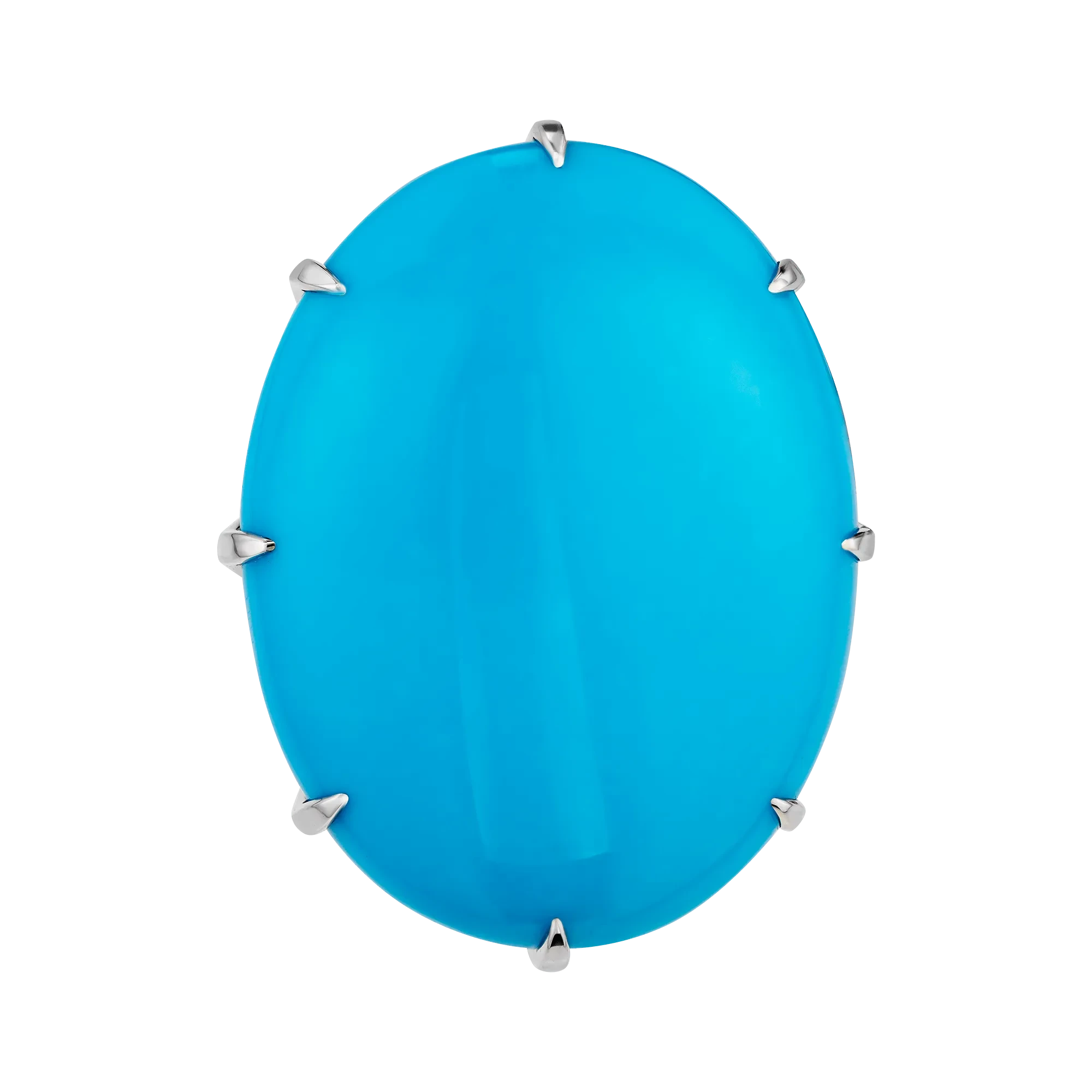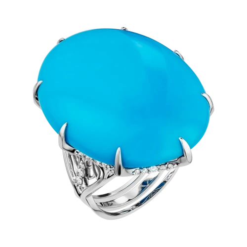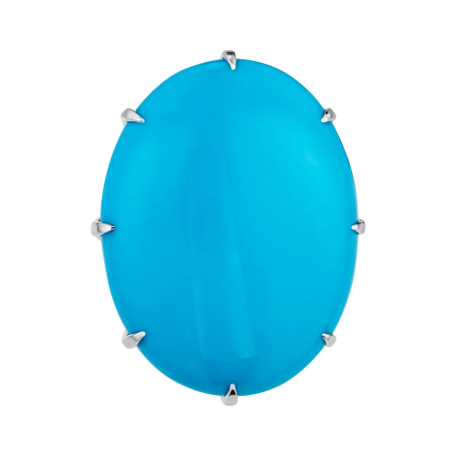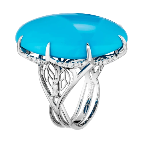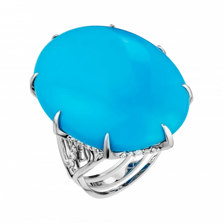 Белое золото оправы создаёт светлый фон для раскрытия бирюзы: его холодный блеск не подавляет, а подчёркивает выразительность цвета, сохраняя ощущение воздуха и простора. Геометрия кольца выстроена с особой тщательностью: линии плавны, но держат форму, не отвлекая от центра, а наоборот – направляя взгляд к нему.