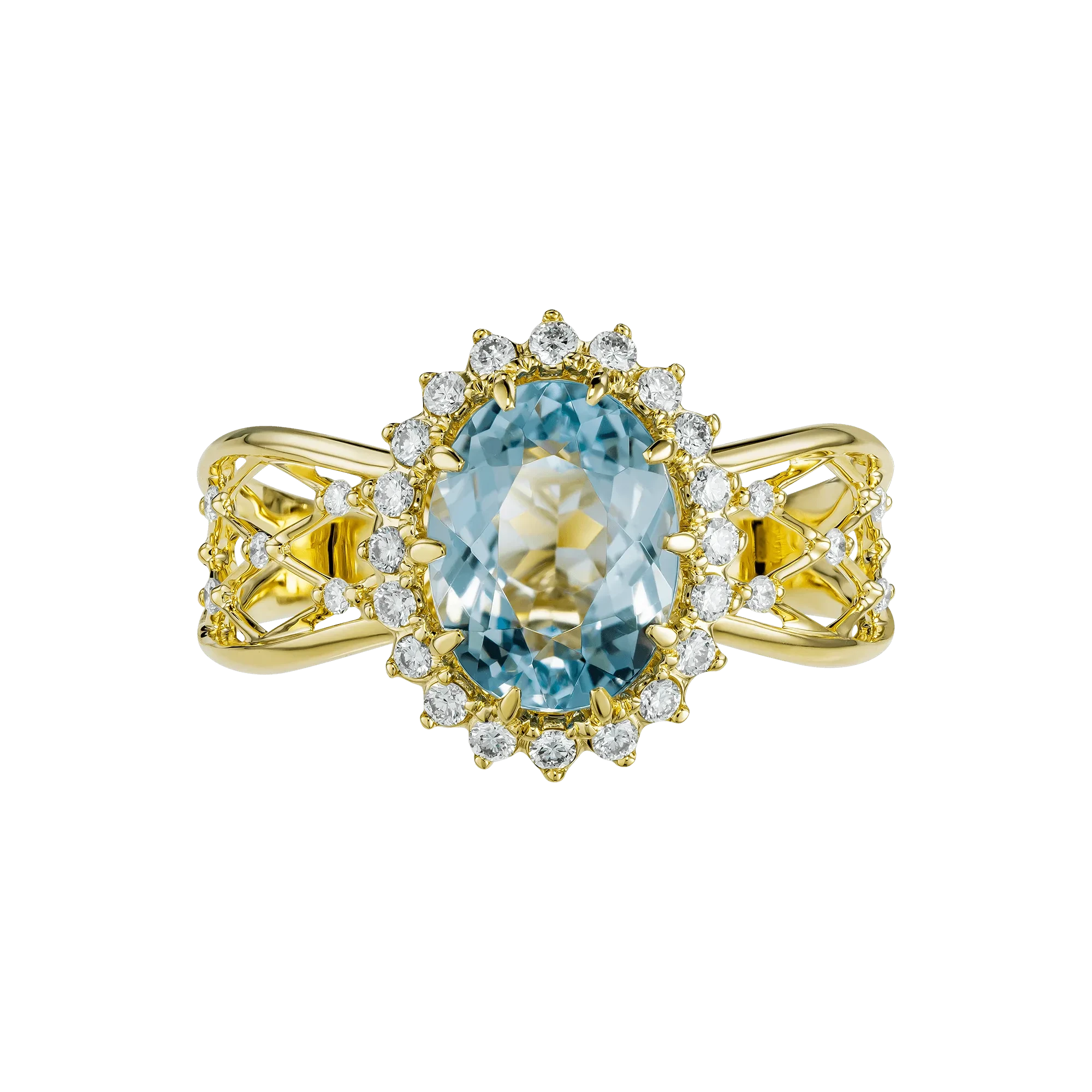 Оправа из жёлтого золота выстроена плавными, направленными линиями, напоминающими постепенное распространение света по горизонту. Тёплый металл подчёркивает холодную чистоту аквамарина, а бриллианты добавляют тонкие акценты сияния, усиливая объём и завершённость образа.