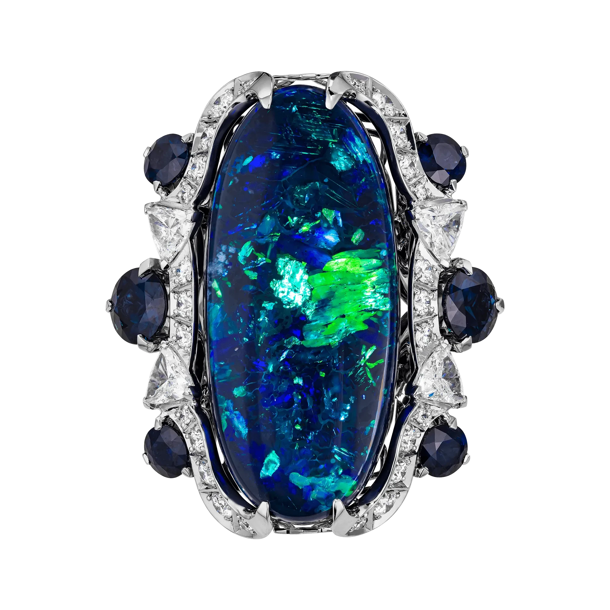В центре композиции – редчайший чёрный опал из Австралии весом 22,78 карата. Его поверхность хранит тайну галактики: всполохи синего, зелёного и лазурного складываются в уникальный опалесцентный рисунок, встречающийся лишь у камней исключительного класса. Подобная игра света – редчайшее явление даже для чёрных опалов, и именно она определяет их высшую ценность в мире высокой ювелирной моды. Каждый поворот камня открывает новую вселенную – от холодного сияния далёких планет до вспышек звёздных туманностей.