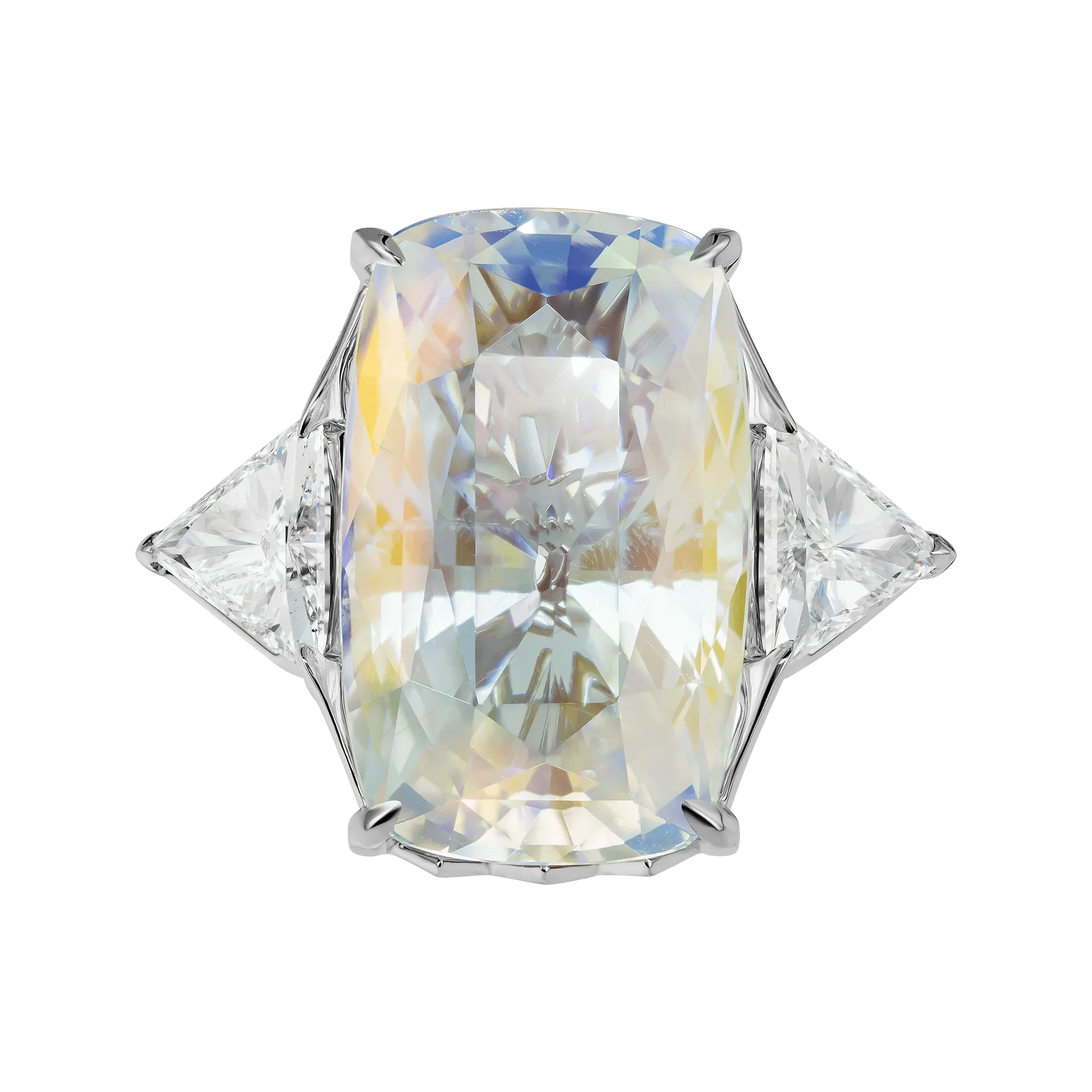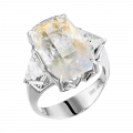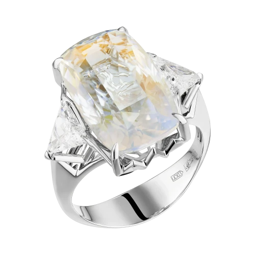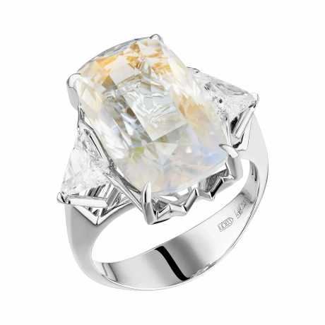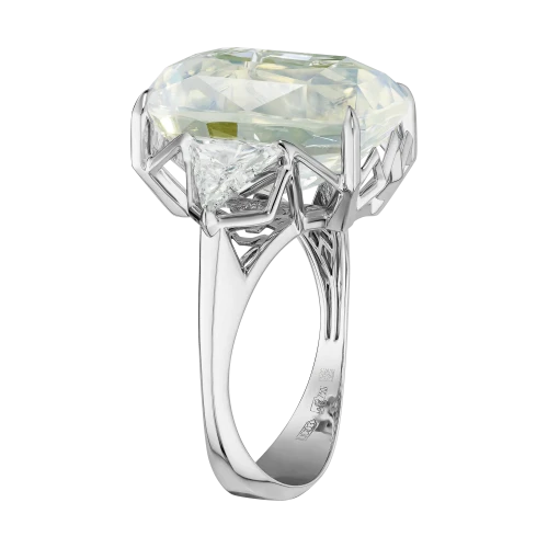 Конструкция оправы построена как продолжение этой световой логики. Белое золото формирует строгую, графичную основу, в которой линии не просто удерживают камень, а направляют движение бликов. Треугольные бриллианты становятся точечными акцентами, усиливая ритм и добавляя композиции архитектурную завершённость. В результате возникает украшение, где свет не просто отражается — он становится главным действием.