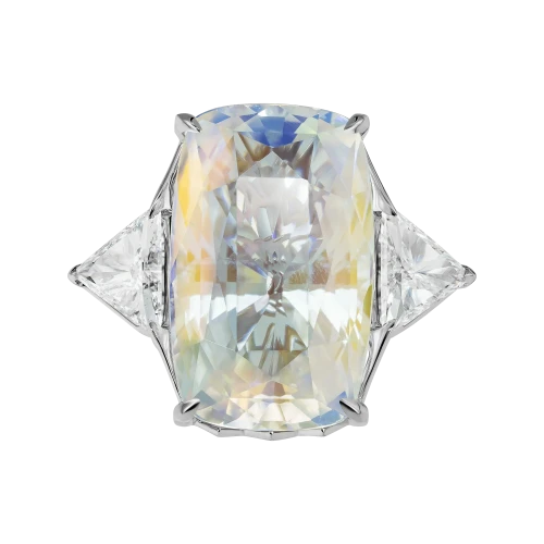 Лунный камень из Мадагаскара весом 11,42 карата раскрыт через огранку «антик», что является редким и сложным решением для этого минерала. В отличие от привычной мягкой дымки, характерной для кабошонов, здесь свет приобретает направленность: он входит в кристалл, разбивается о грани и возвращается мягкими, но чёткими всполохами. Эффект адуляризации проявляется глубже и структурнее, создавая ощущение внутреннего свечения, заключённого в геометрии.