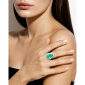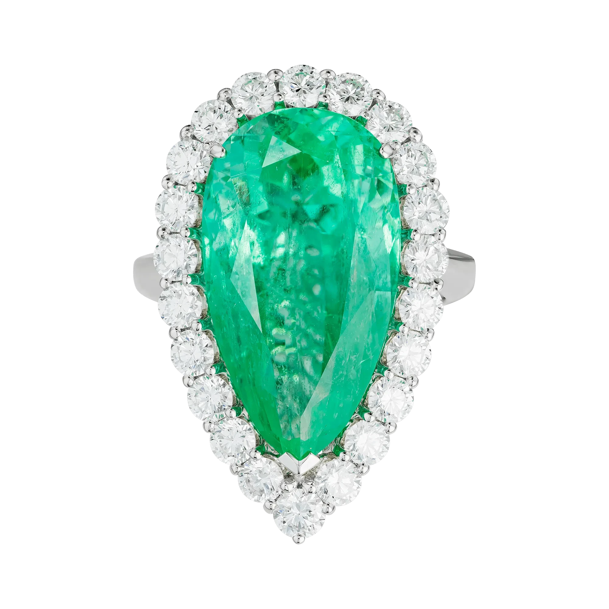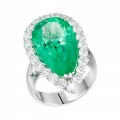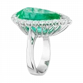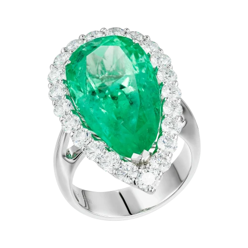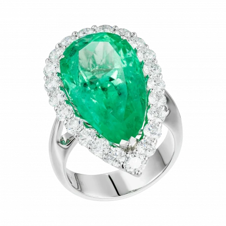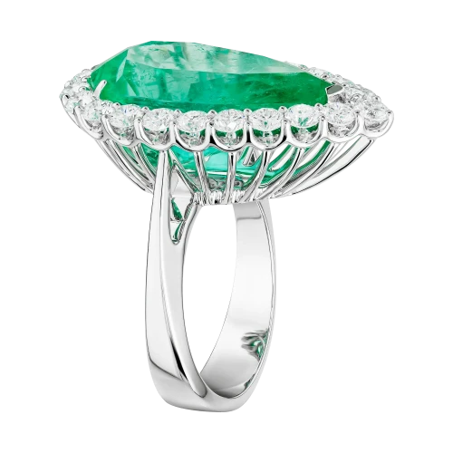 Нежное сияние центрального камня поддержано роскошной россыпью безупречных бриллиантов, выложенных по классической оправе из белого золота. Их холодный свет подчёркивает прозрачность и форму изумруда, усиливая ощущение чистоты и визуальной лёгкости. Каплевидная огранка придаёт композиции эмоциональную выразительность, превращая драгоценный камень в символ откровенного, почти неуловимого мгновения.