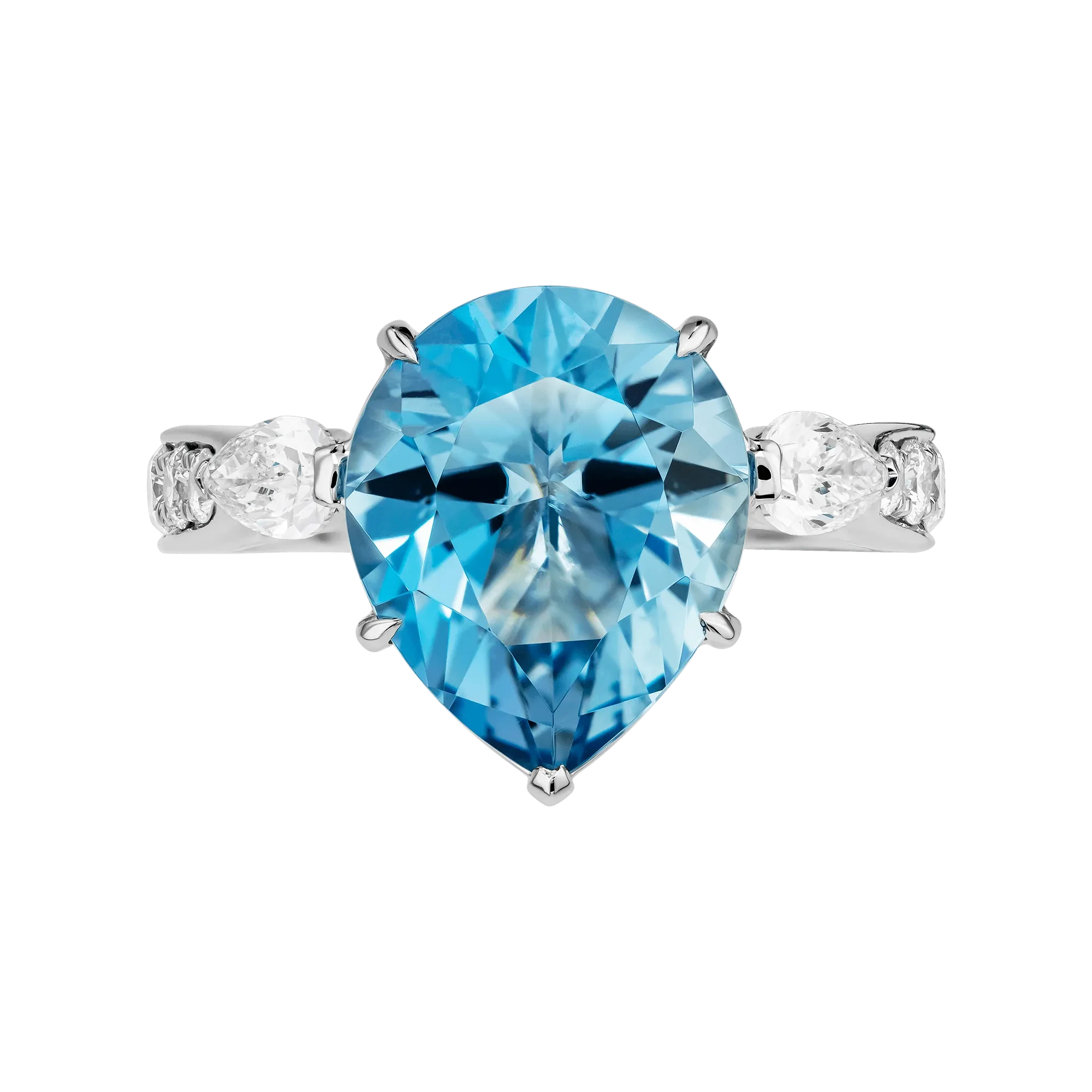 В центре композиции – аквамарин из Мозамбика весом 4,42 карат. Его цвет словно вобрал в себя самую суть высокогорных озёр – чистоту, свежесть, переменчивость светотени и глубину, не поддающуюся описанию. Особая каплевидная форма огранки усиливает эффект «живой воды»: она направляет свет, создает игру бликов, передаёт ощущение пространства и движения.