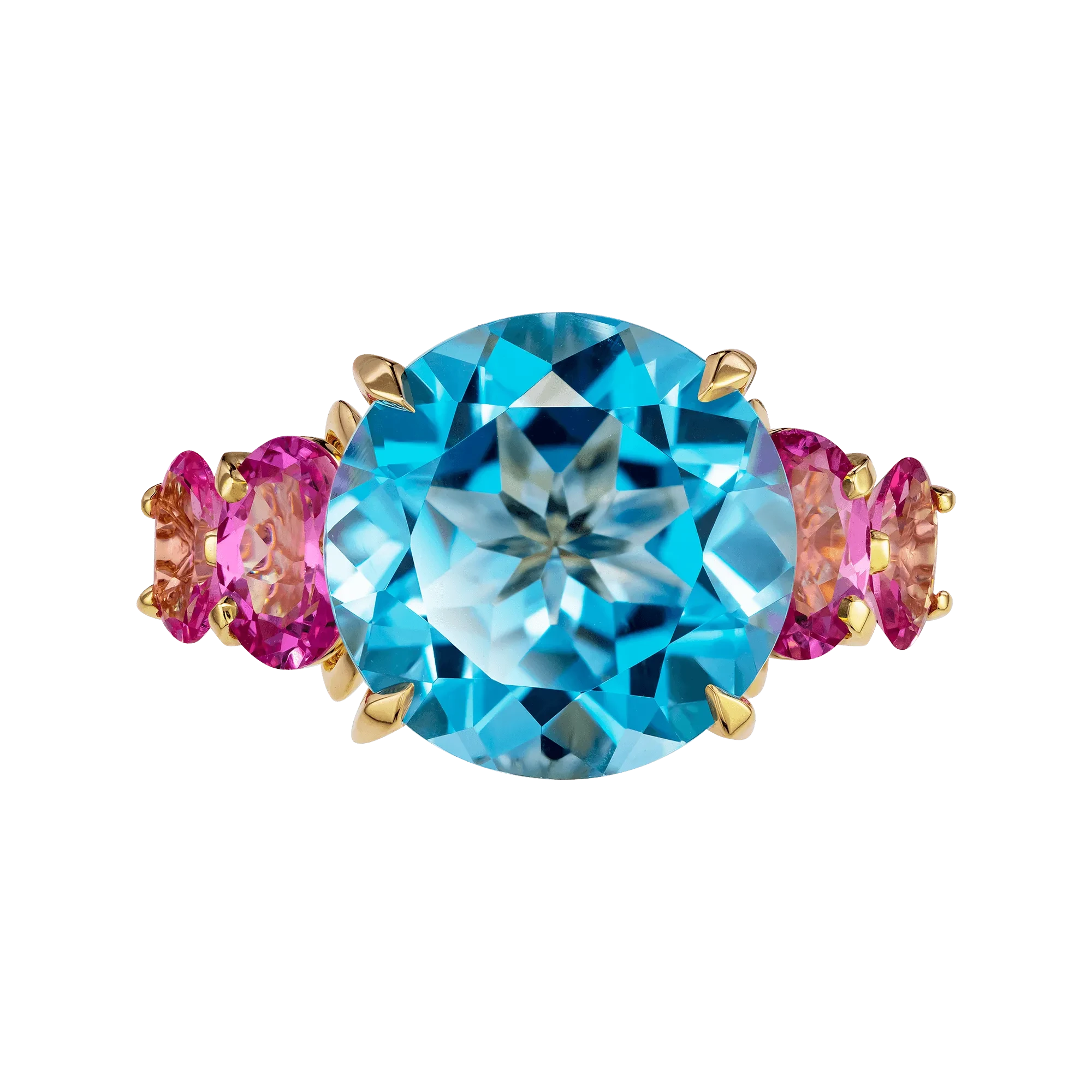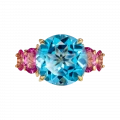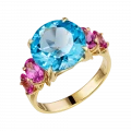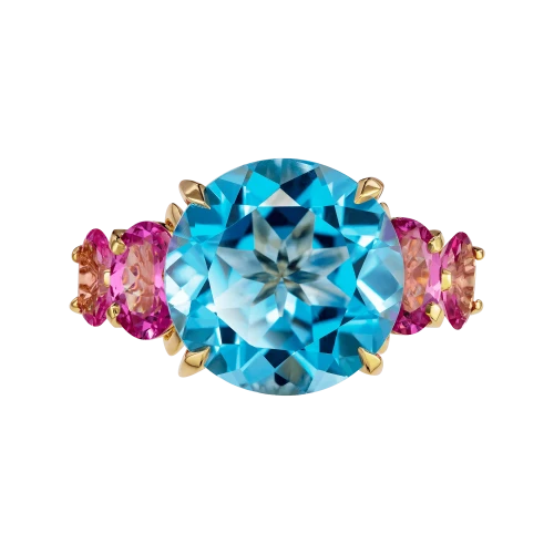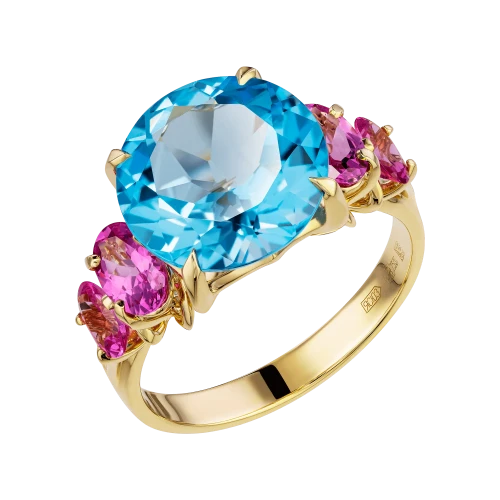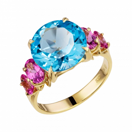 В центре – небесный топаз, прозрачный, как взгляд, в котором нет ни тени сомнения. Его круглая огранка делает свет почти живым – он струится сквозь грани, как мягкое течение воды. С двух сторон топаз обрамлён шпинелью ягодного оттенка – чуть приглушённого, бархатистого, как полутон в голосе. Это не контраст, а диалог: между свежестью и теплом, прозрачностью и глубиной.