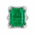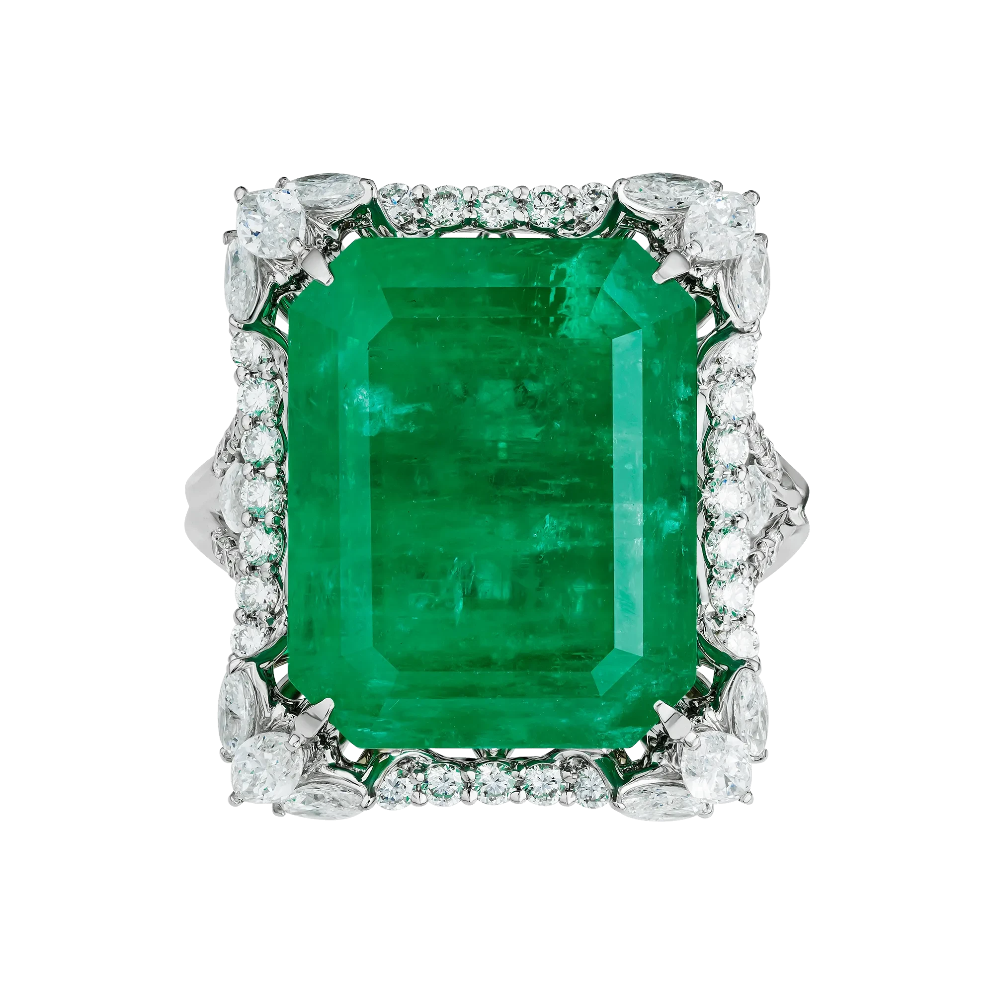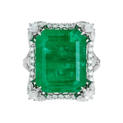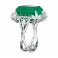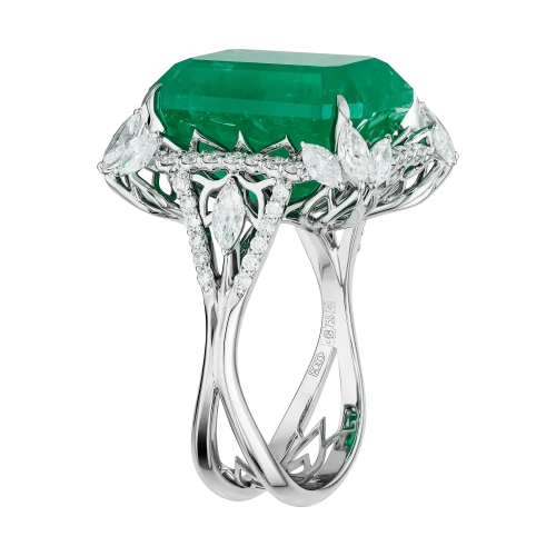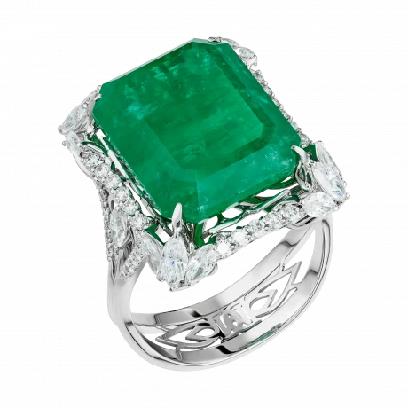 Конструктив оправы выстроен таким образом, что изумруд визуально приподнят над поверхностью кольца и словно парит в пространстве света. Архитектурные линии из белого золота инкрустированы бриллиантами различной огранки, создающими многослойную структуру сияния. Контраст прозрачного блеска и плотной зелёной глубины усиливает монументальность центрального камня и подчёркивает его статус.
