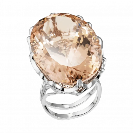 В центре композиции – морганит весом 67,02 карата, редкий природный минерал исключительной чистоты и утончённого сияния. Его мягкий оттенок переливается на грани персикового и розового, словно он вобрал тепло солнца и прозрачность рассветного неба. Подобные экземпляры встречаются в природе единично: каждый уникален по цвету и прозрачности.