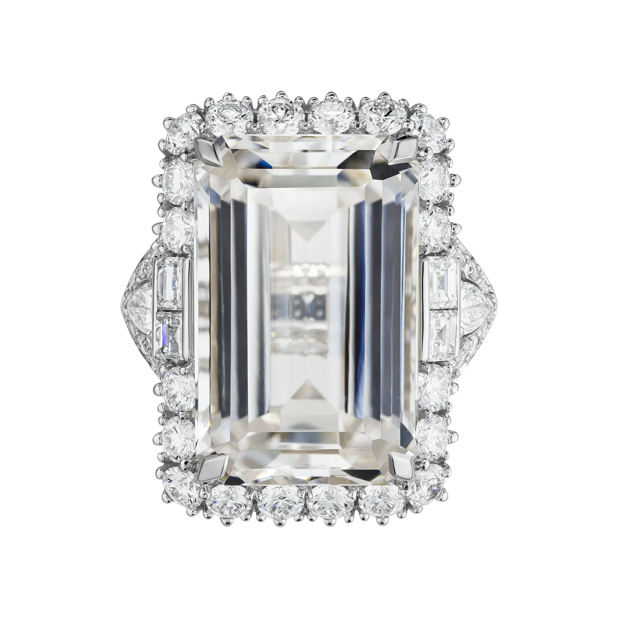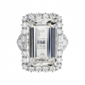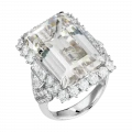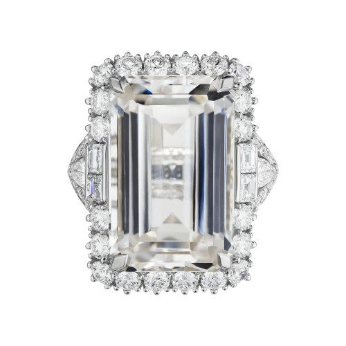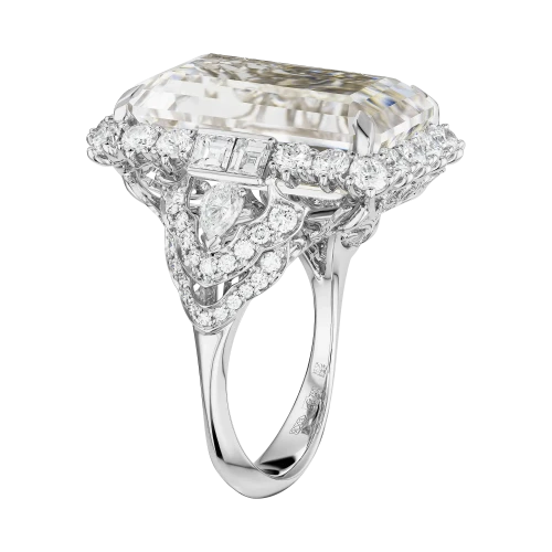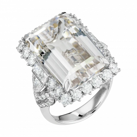 Архитектура кольца выстроена вокруг этой прозрачности. Белое золото формирует сложную, почти невесомую конструкцию, которая удерживает самоцвет, не нарушая его визуальной лёгкости. Линии оправы напоминают тонкое кружево, где каждая деталь работает на раскрытие света. Бриллианты, инкрустированные в основу, добавляют точечные акценты, усиливая глубину и создавая эффект многослойного мерцания.
