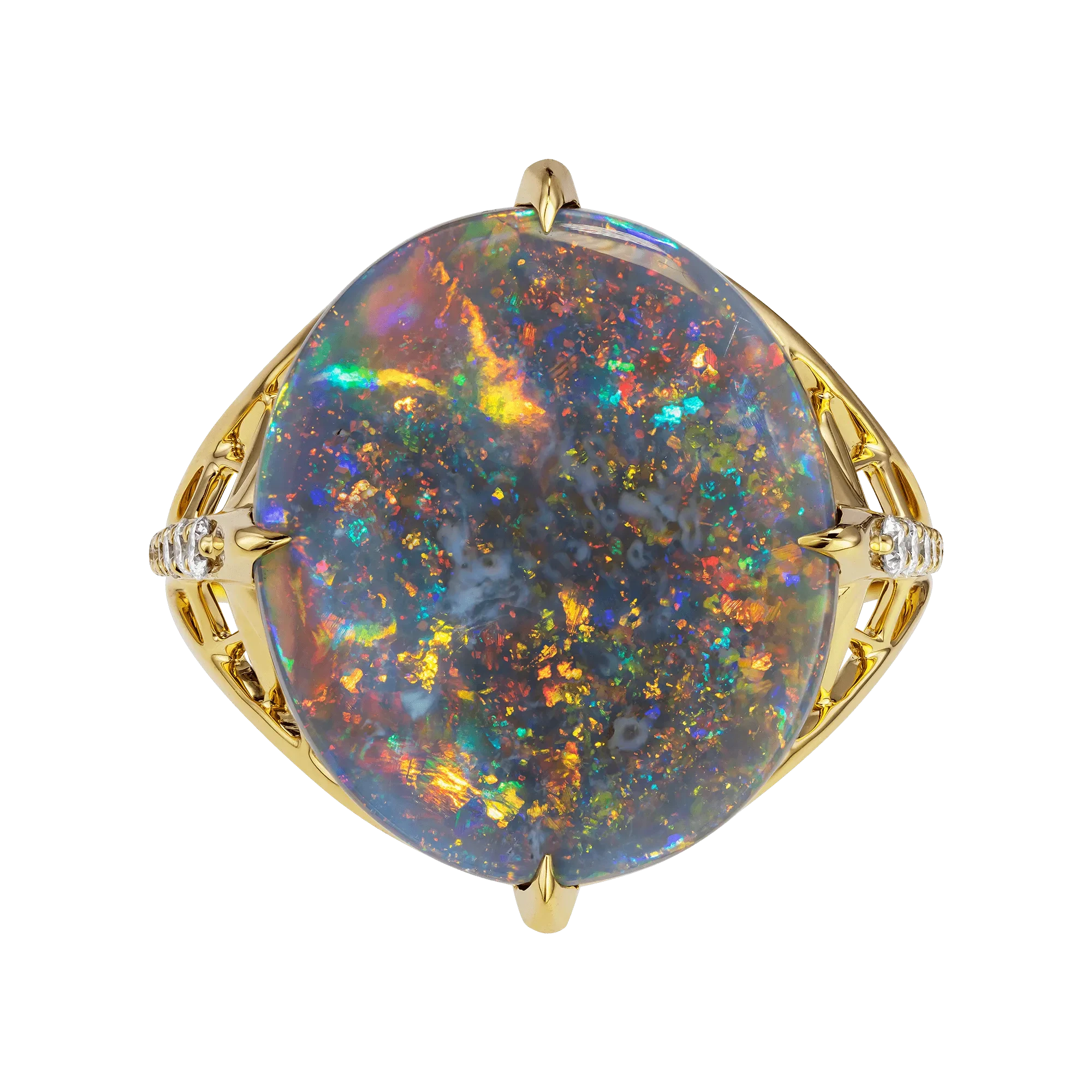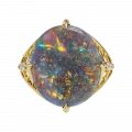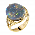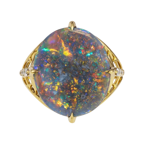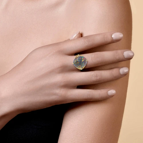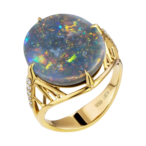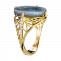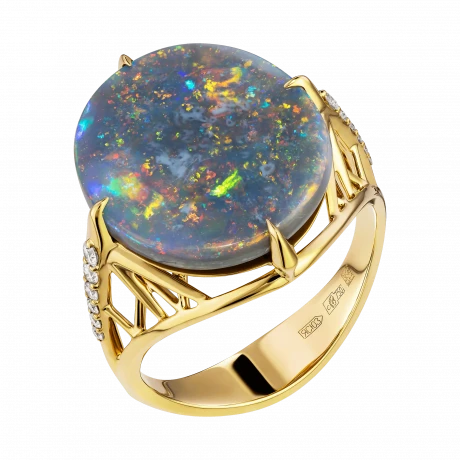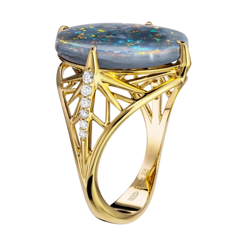 В центре композиции – редкий австралийский опал весом 6,20 карата. Его глубокий серо-голубой тон с вкраплениями ярких радужных всполохов действительно напоминает ночное небо в движении. Каждый поворот кольца – как новая звезда, вспыхивающая в мятной, лазурной или золотистой гамме.