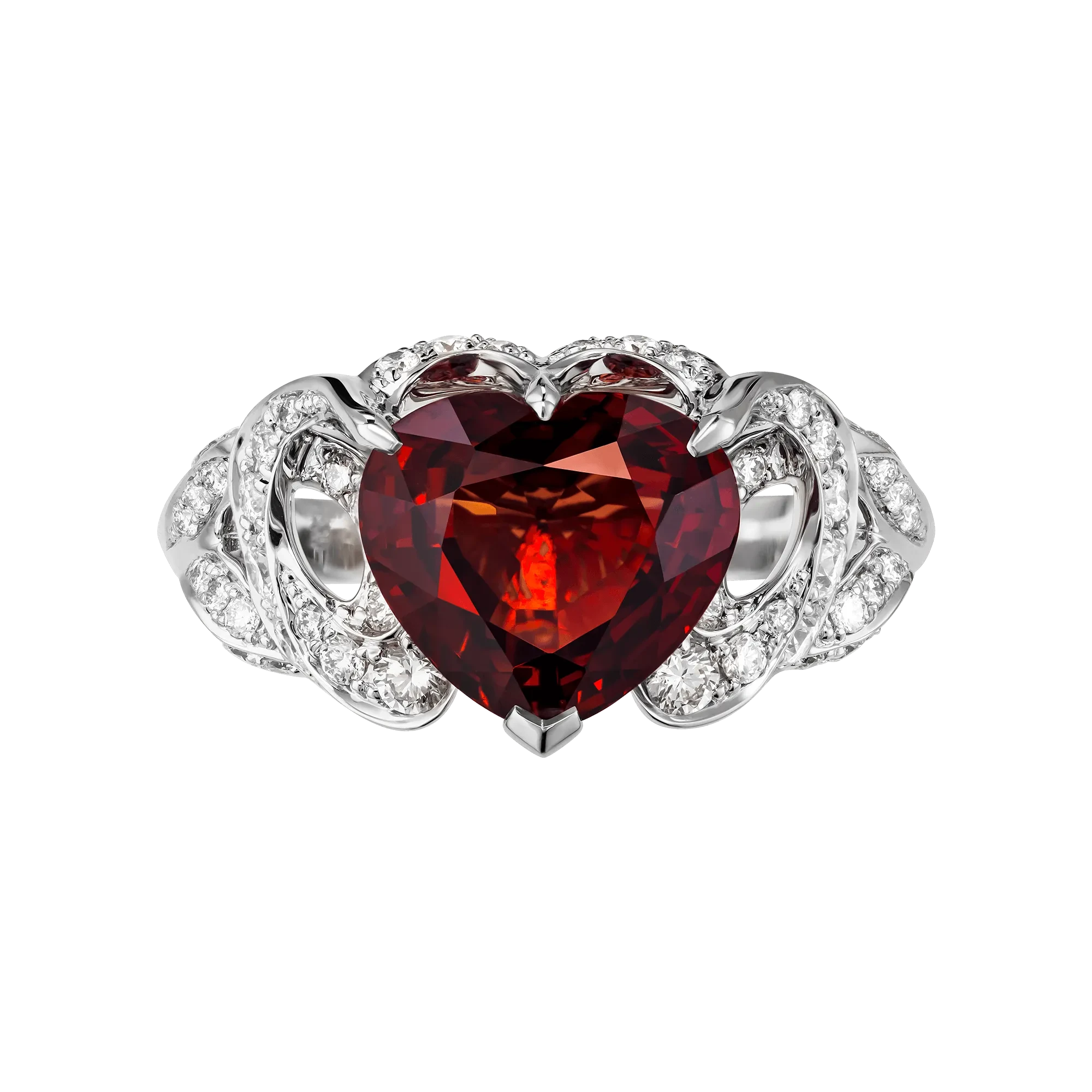Ажурная оправа из белого золота, украшенная россыпью бриллиантов, создаёт вокруг благородной шпинели мерцающее сияние, словно усиливающее её жар. Каждая грань самоцвета отражает пульсирующую энергию, превращая камень в аллегорию страсти и вдохновения.