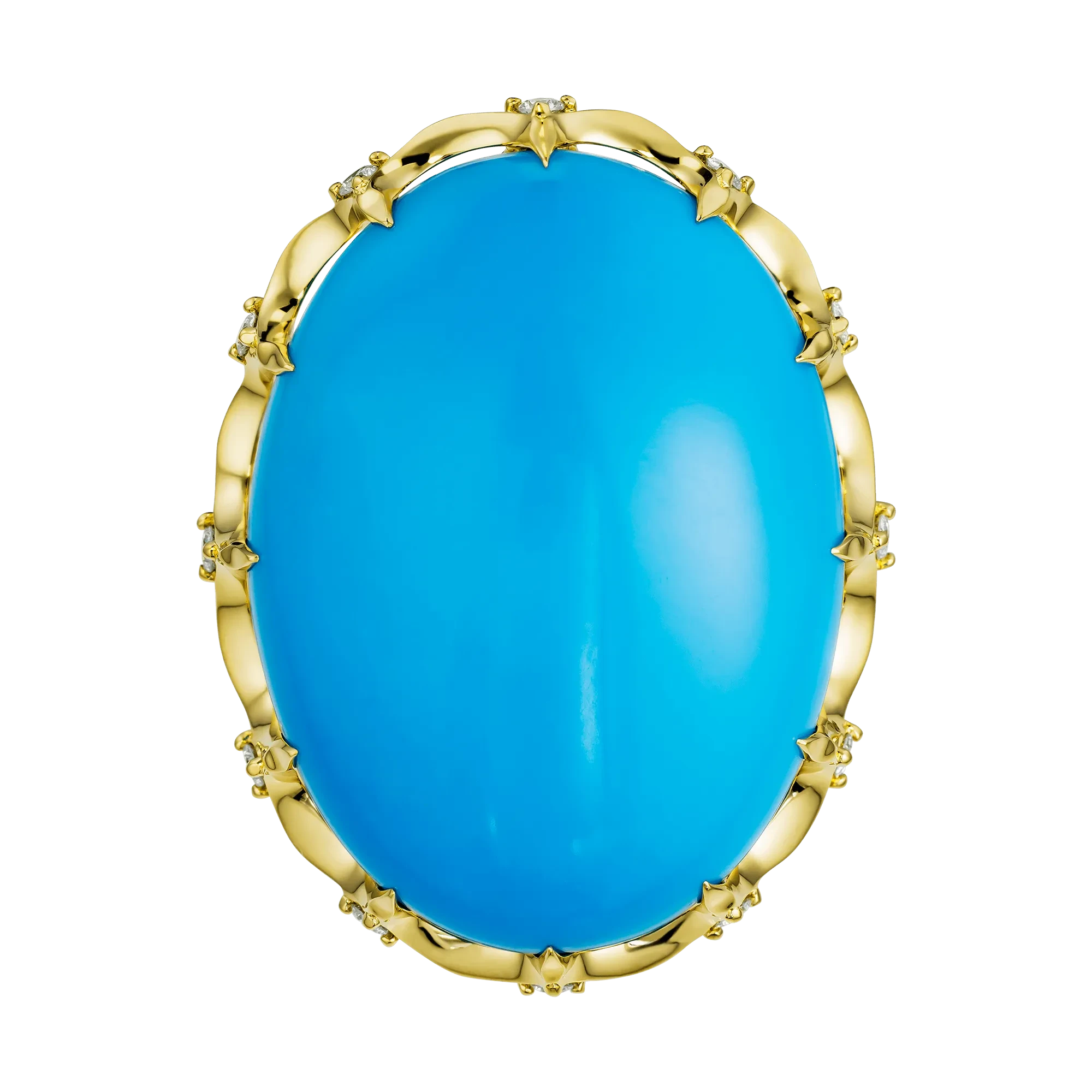 В центре композиции — крупная природная бирюза из Аризоны, камень с редкой глубиной цвета и живым природным рисунком. Её небесно-голубой оттенок воспринимается как пространство без границ. Бирюза здесь не просто декоративный элемент, а символ дороги — внешней и внутренней, наполненной смыслом и открытием.