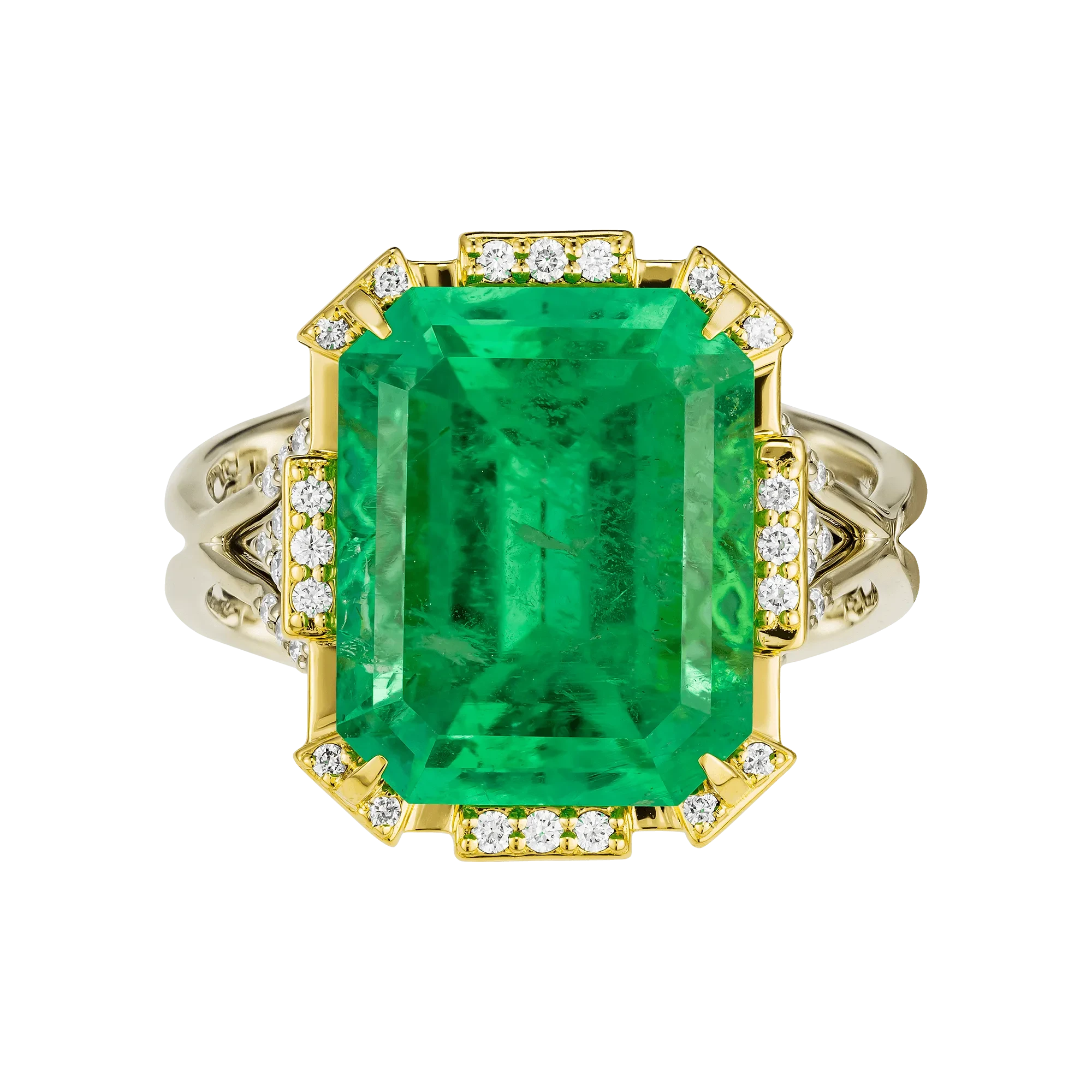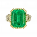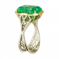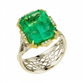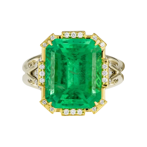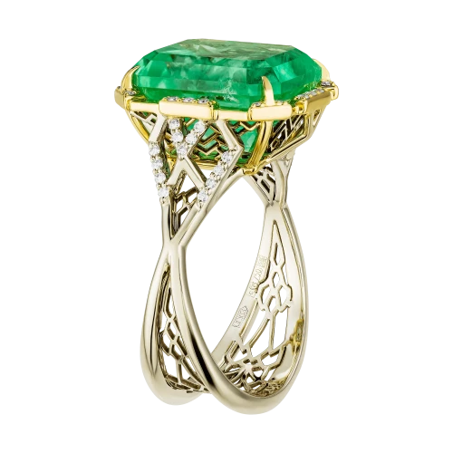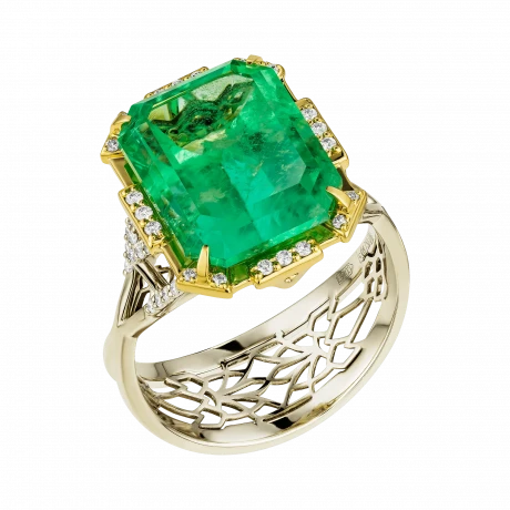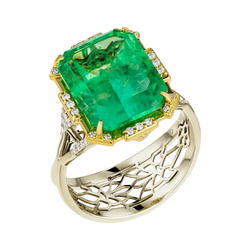 Оправа из комбинированного жёлтого и белого золота выстроена с акцентом на контраст и баланс. Тёплый оттенок жёлтого золота усиливает природную насыщенность изумруда, в то время как белое золото и бриллианты формируют чёткую световую структуру, добавляя композиции графичность и глубину. Кольцо воспринимается как цельный ювелирный образ, в котором редкость камня и точность исполнения соединяются в выразительное и современное высказывание.