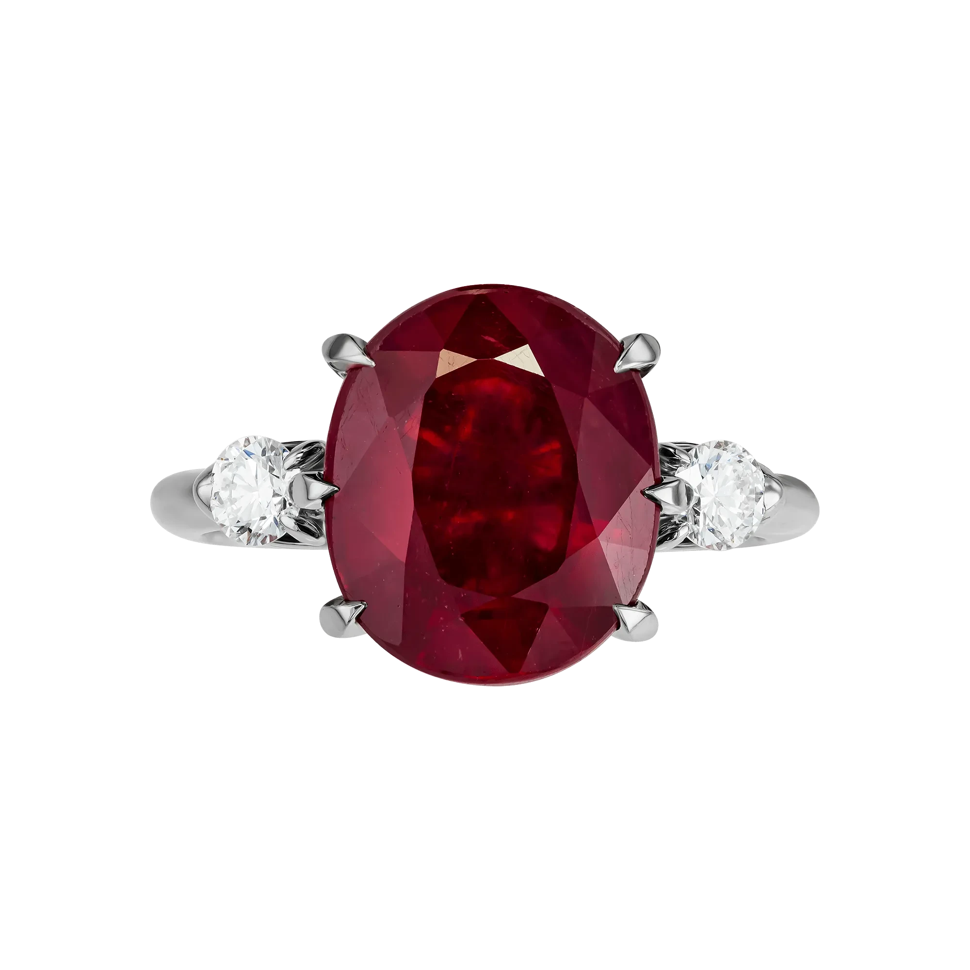 Оправа из благородной платины выстроена с подчёркнутой сдержанностью и точностью. Холодный металл создаёт выразительный контраст с горячей природой рубина, усиливая ощущение, будто огонь намеренно заключён в строгую форму. Бриллианты добавляют чёткие световые акценты, подчёркивая объём самоцвета и усиливая его глубину, не нарушая общей строгости образа.