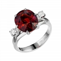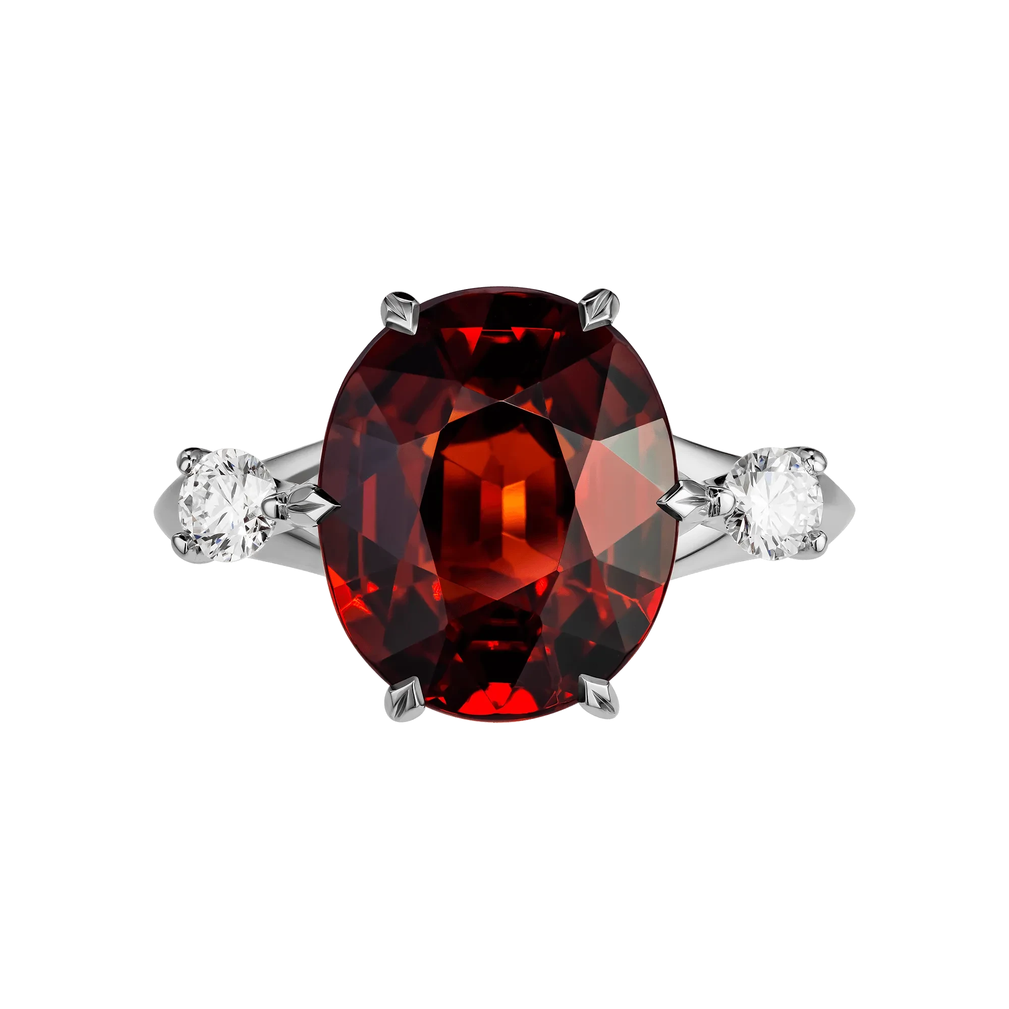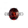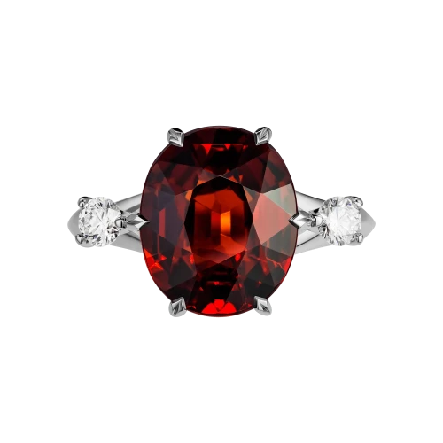 Холодное сияние бриллиантов подчёркивает жар центрального камня, добавляя композиции графичности и ритма. А платиновая оправа, благородная и строгая, собирает все элементы воедино, придавая кольцу ощущение цельности, силы и уверенной сдержанности.