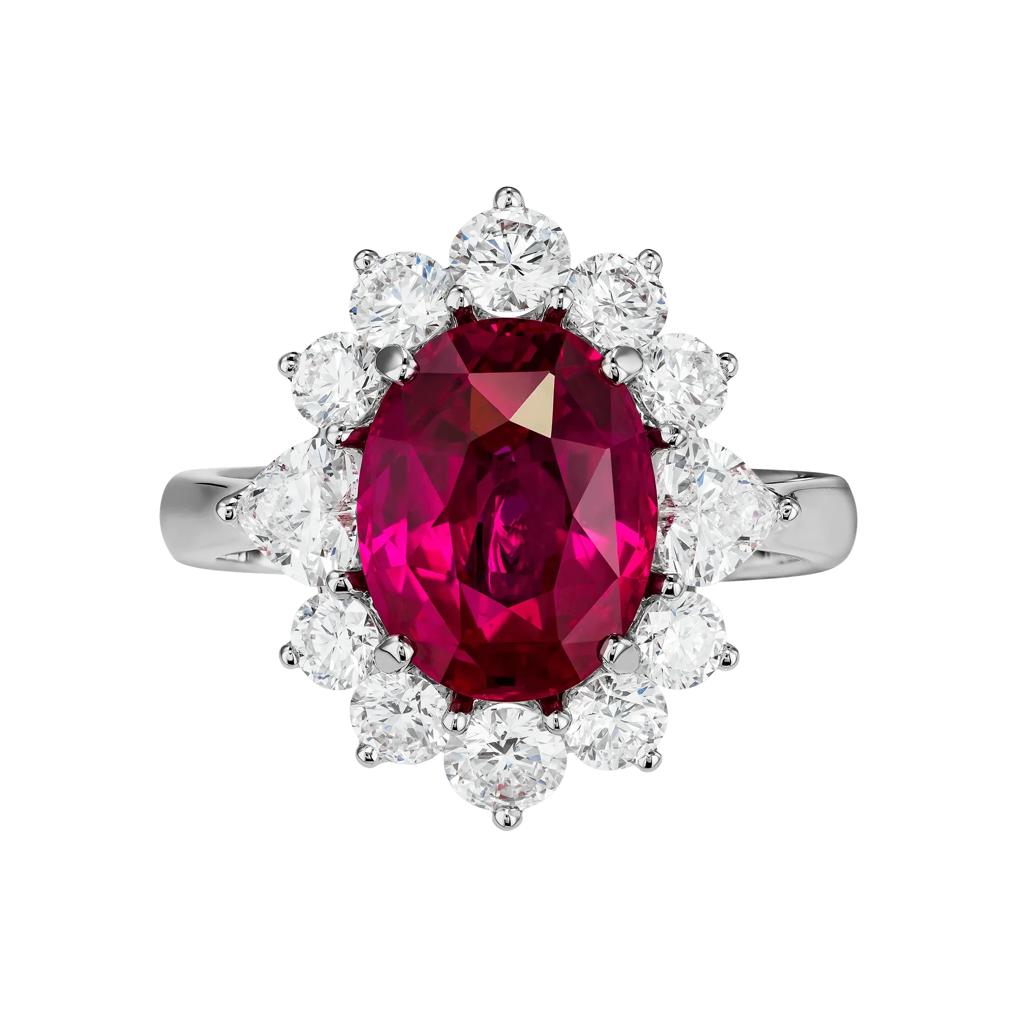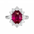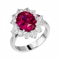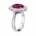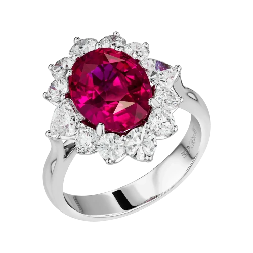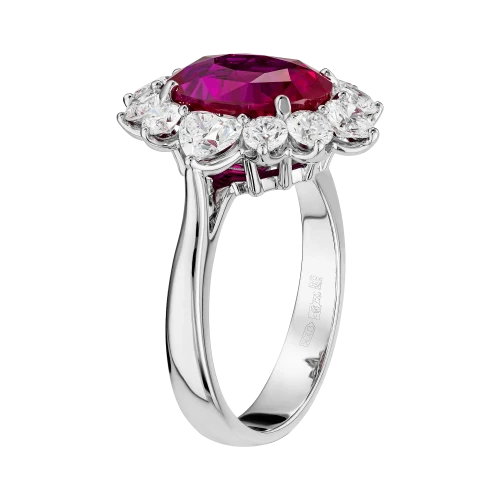 Цвет рубина демонстрирует высокую степень насыщенности и чистоты, позволяя свету равномерно распределяться внутри кристалла и усиливать его природную яркость. Ореол из бриллиантов, обрамляющий центральный камень, работает как световой усилитель, подчёркивая глубину оттенка и создавая контраст, на фоне которого рубин раскрывается максимально выразительно. Белое золото оправы добавляет композиции графичность и чистоту, усиливая визуальную силу камня.
