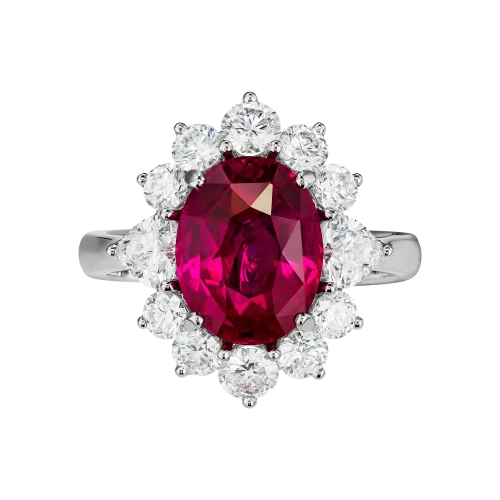 В центре композиции — рубин весом 5,89 карата, добытый в регионе Mogok, который по праву считается историческим и геологическим феноменом. Уникальные условия формирования — сочетание мраморных пород и минимального содержания железа — позволяют камням сохранять чистый, насыщенный красный цвет без затемнения. Добыча в этом регионе ведётся ограниченно и преимущественно вручную, что делает крупные и чистые экземпляры особенно редкими.