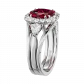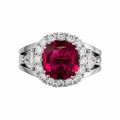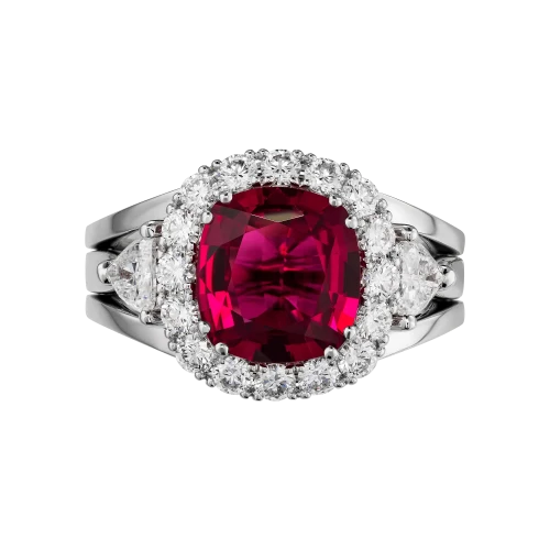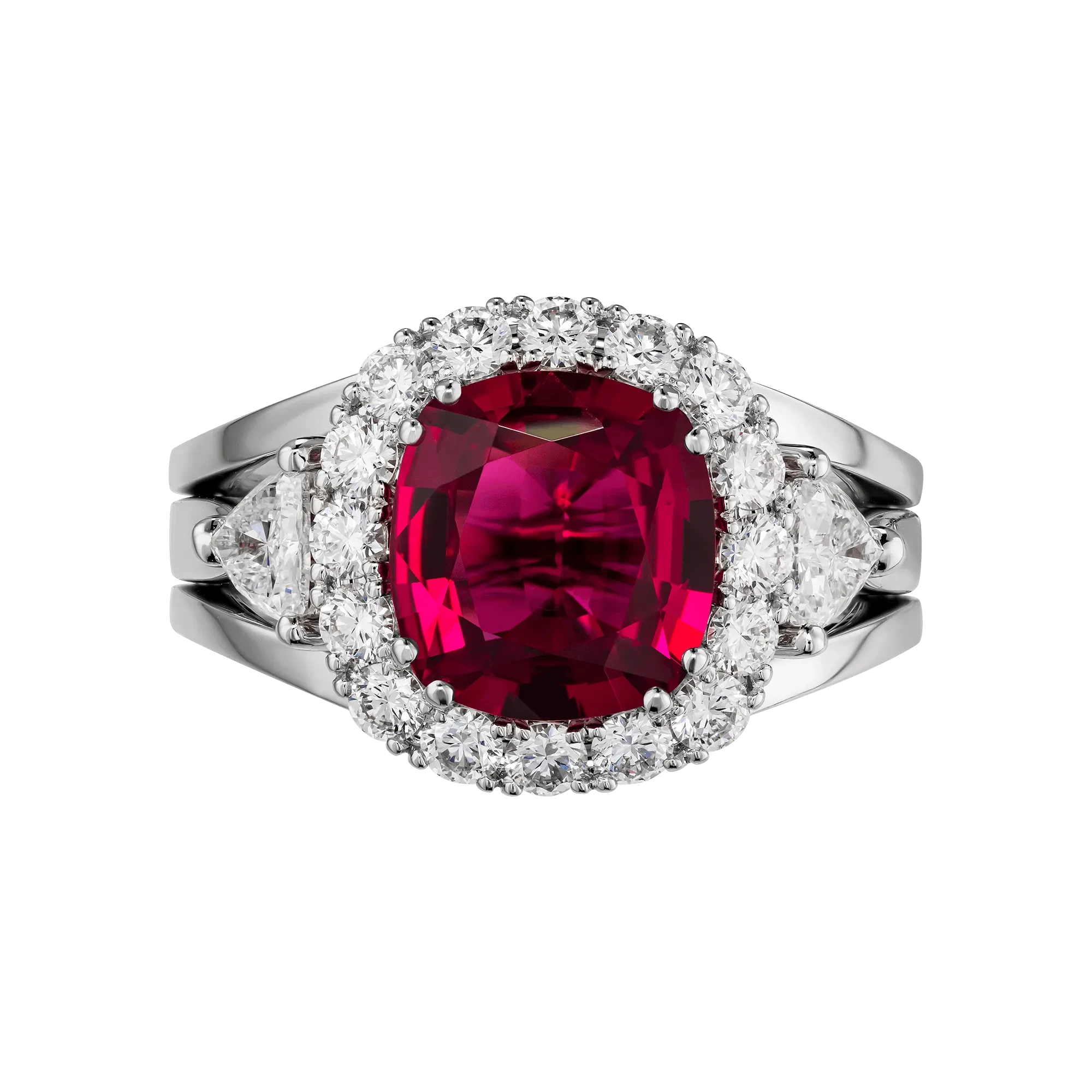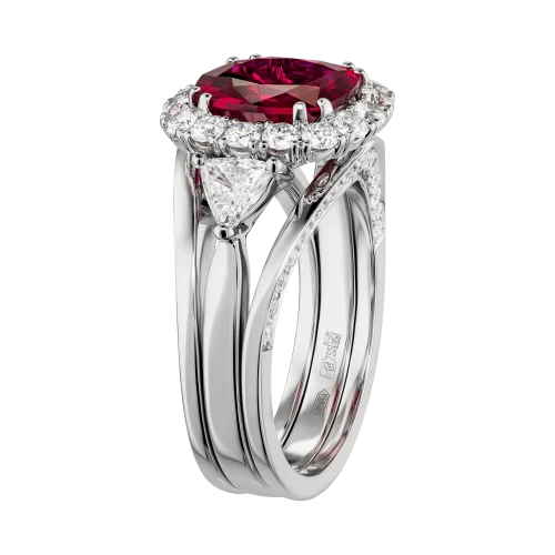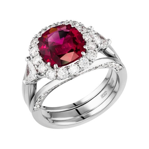Мастера Maxim Demidov подчеркнули благородство шпинели ореолом безупречных бриллиантов, обрамляющих камень в роскошной оправе из белого золота. Контраст холодного блеска металла и тёплого сияния шпинели рождает ощущение дыхания света, будто в её глубине живёт пульс самой энергии.