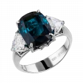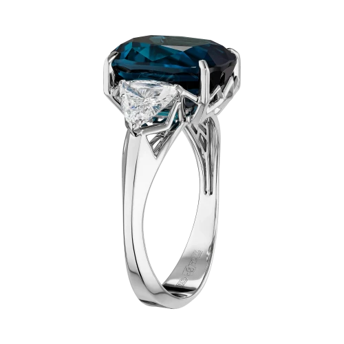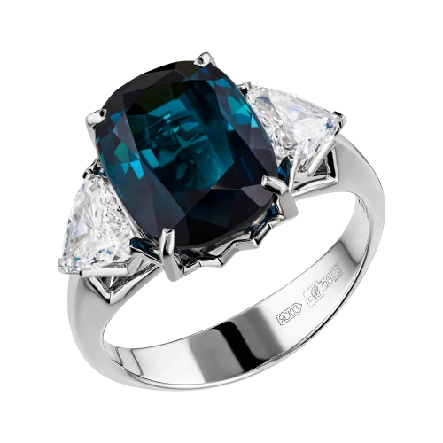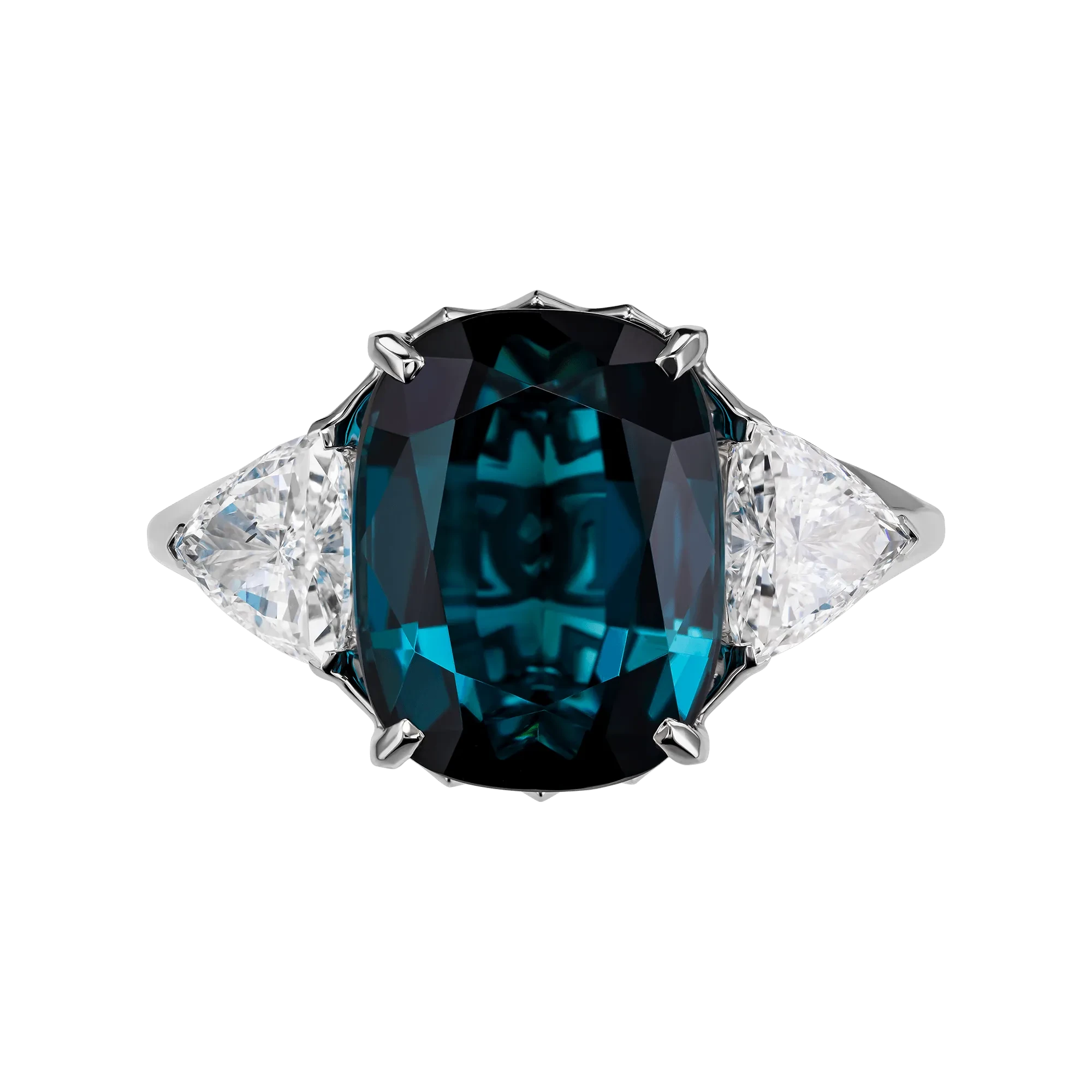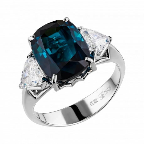 С обеих сторон индиголит сопровождают крупные бриллианты огранки «триллион». Их сияние словно указывает направление, усиливая символику пути и внутреннего света. Оправа из белого золота с безупречно гладкой шинкой отражает чистоту формы и точность замысла.
