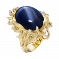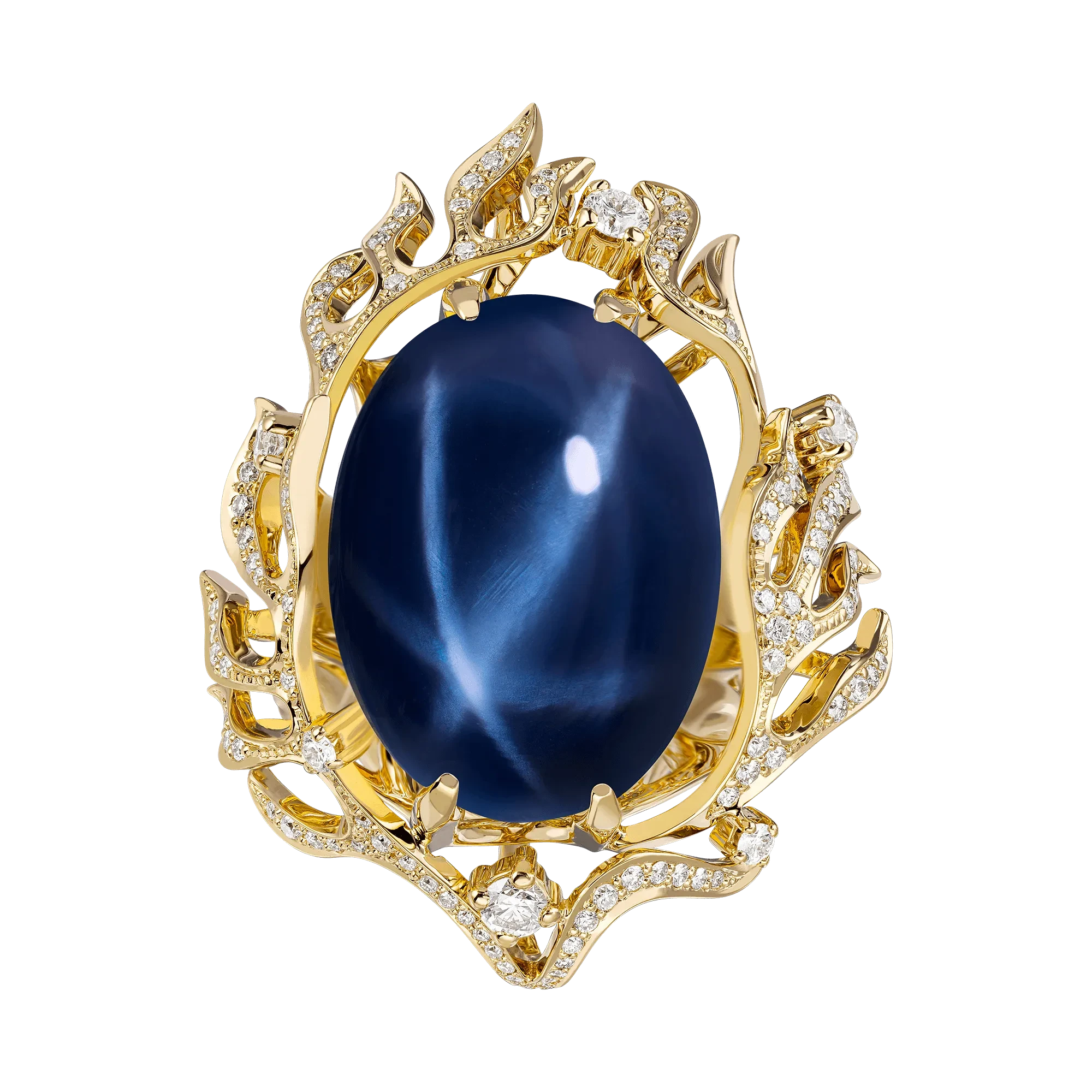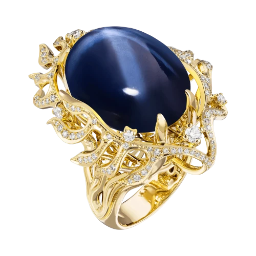 Оправа из жёлтого золота выстроена как сложный, почти органический каркас. Витиеватые линии не закрывают самоцвет, а лишь мягко поддерживают его, сохраняя максимальную открытость поверхности и позволяя свету свободно взаимодействовать с сапфиром. Такая архитектура подчёркивает масштаб центрального камня и усиливает впечатление его спокойной, уверенной силы.